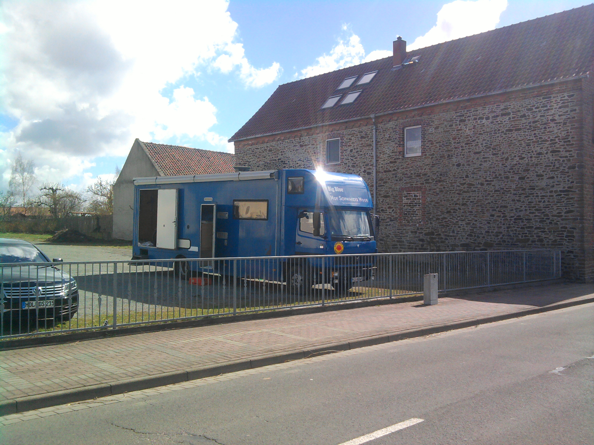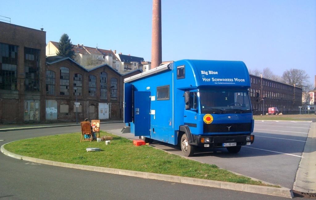 Wir kaufen ein paar Lebensmittel in einem Supermarkt ein. Wir sind schon in der ehemaligen DDR. Und hier gibt es keine normalen Läden mehr. Heidi geht rein. Ich gehe mit Lara im angrenzenden Möchtegern Gewerbegebiet spazieren. Hier übernachten scheinbar hauptsächlich Trucker. Lara findet zielsicher einen Scheisshaufen eines Truckers. Und was machen Hunde so gerne? Glücklicherweise lässt sich Lara so verschmiert wie sie ist in die Werkstatt in Big Blue locken. Denn hier vor Ort haben wir keine Chance sie wieder sauber zu bekommen.