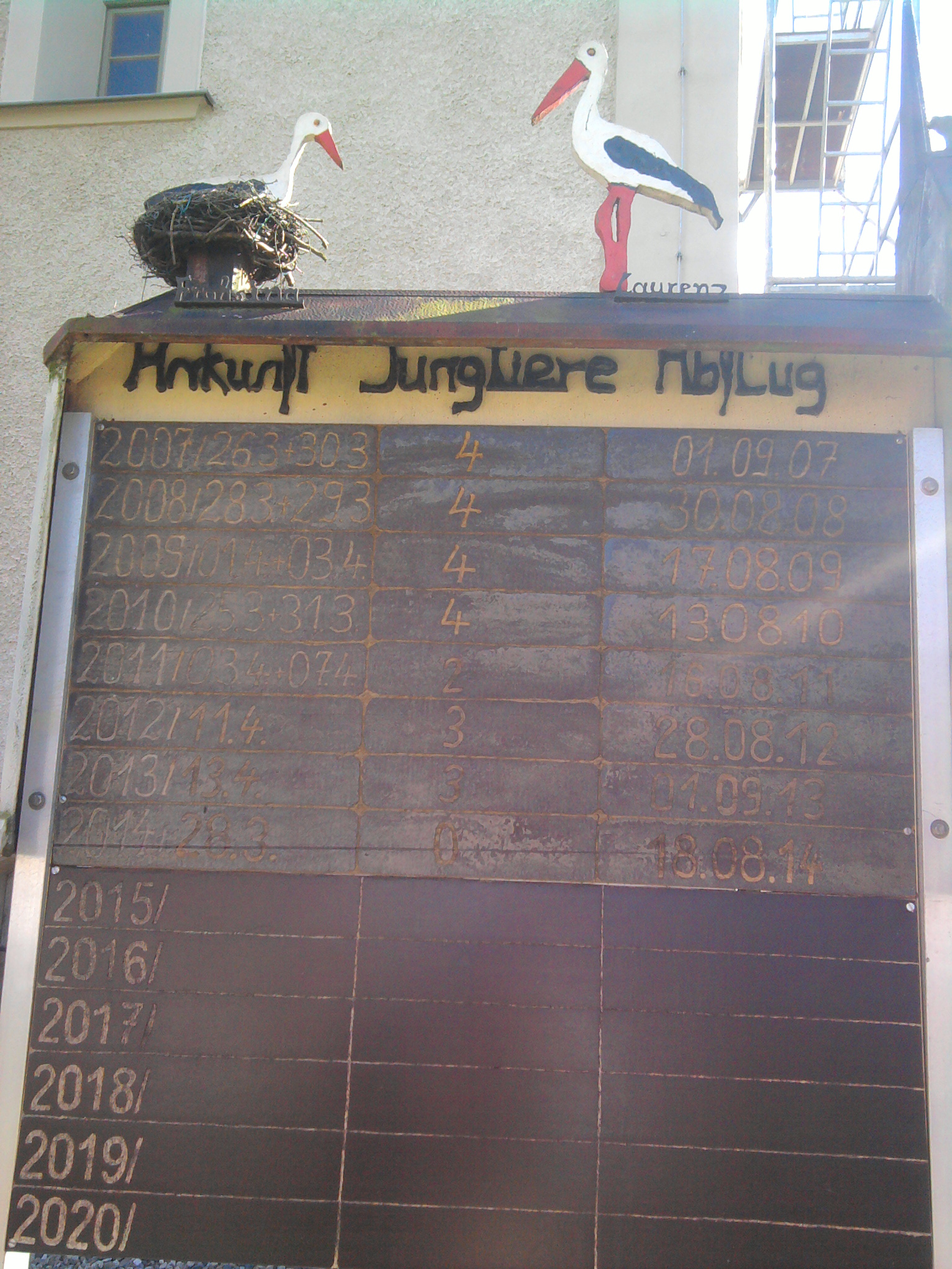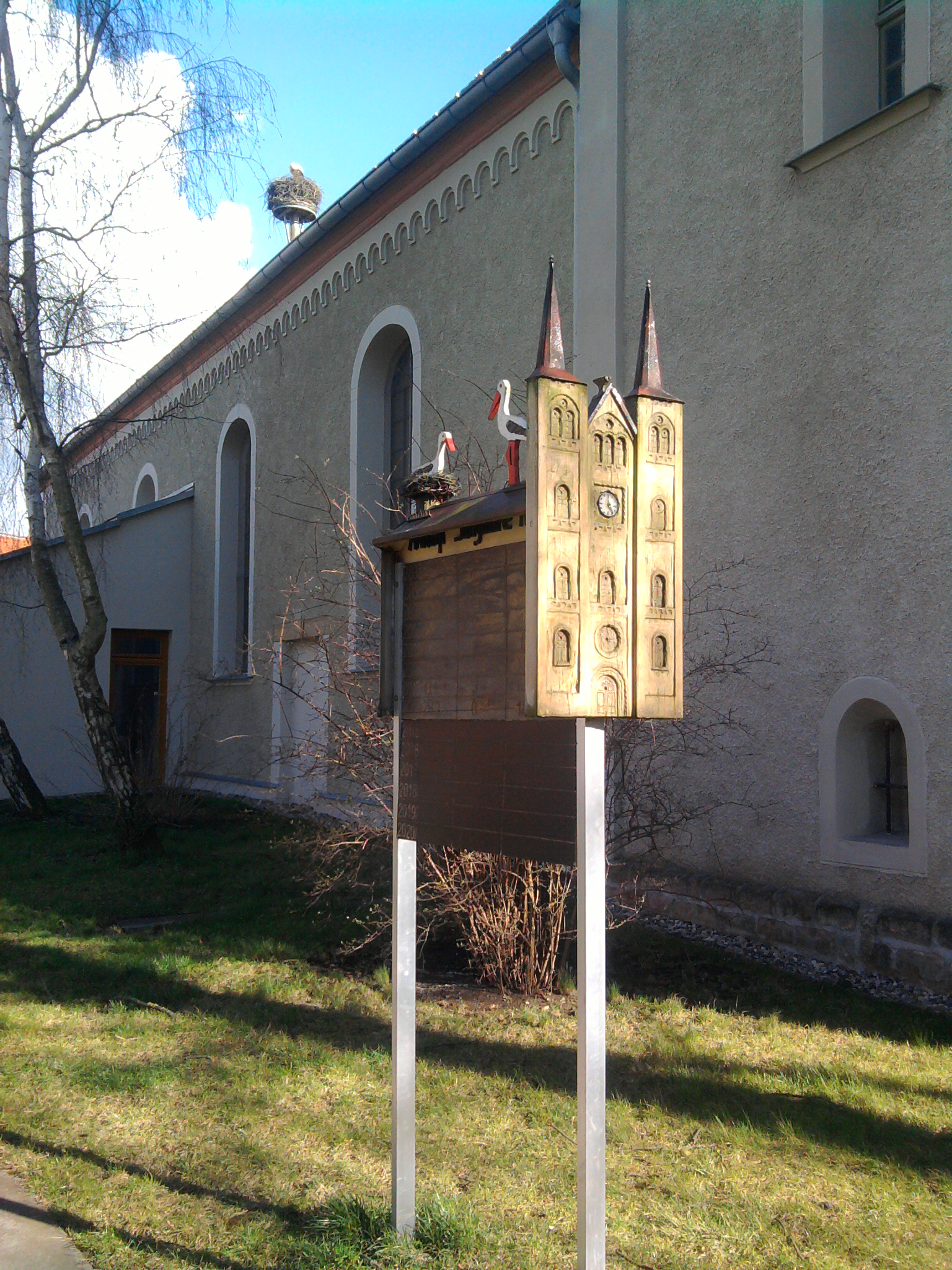 Gleich zu Beginn steht eine Kirche mit Storchennest und einer Tafel mit Infos, wann die Störche da waren und wie viel Nachwuchs sie hatten.