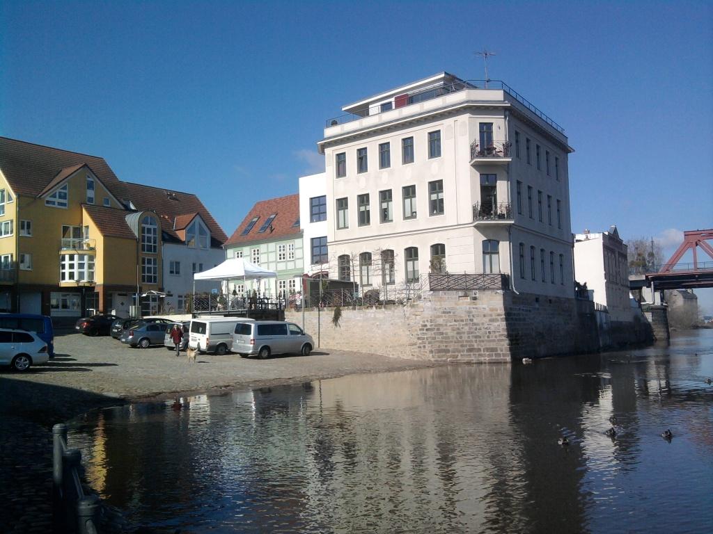 Nach einem kleinen Mittagsimbiss fahren wir zusammen noch einmal nach Schönebeck. Wir schaffen es bis ungefähr zur Mitte. Hier versinkt die Straße in der Elbe. Und in diesem Restaurant gibt es wirklich gutes Eis.