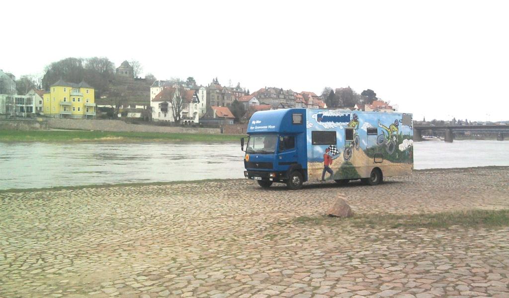 Für Dresden habe ich mich vorbereitet. Direkt an der Marienbrücke im Norden der Stadt gibt es auf der Westseite der Elbe einen recht gut gelegenen Parkplatz, der für Wohnmobile freigegeben ist. Über die Brücke führt übrigens die Bundesstraße 6. Auch eine Form Zuhause Gefühl. Leider ist ein Teil des Platzes heute mit einem Rummel belegt. So haben wir natürlich Angst, ob es hier nachts nicht etwas unruhig wird. Entweder durch die Veranstaltung selbst oder aber durch Betrunkene, die uns hier mit ihrem Gegröle beglücken wollen.