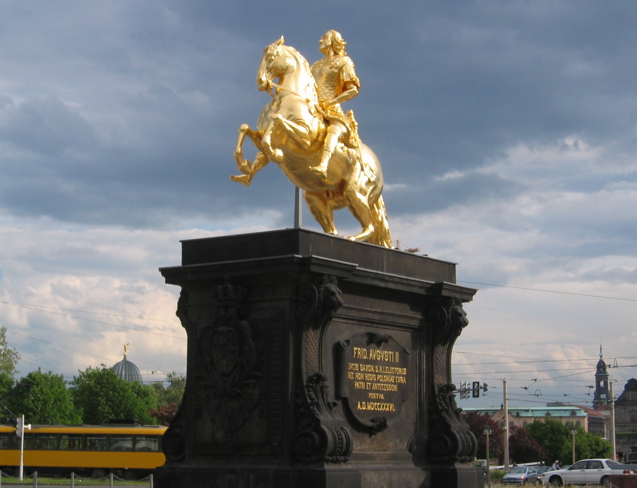 Auf der Ostseite der Elbe sehe ich mir noch eine Platz an. Der liegt zwischen Hotels und Regierungsgebäuden an der Augustusbrücke, ist mit Bäumen bepflanzt und wirkt recht vielversprechend. Aber mit Big Blue kommen wir da nicht unter den Bäumen durch.