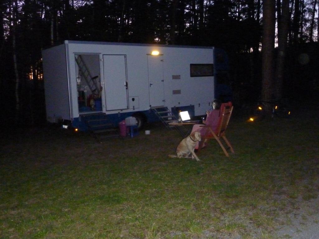 Auf den Campingplatz Borny werden wir nicht drauf gelassen. Wegen Lara. No dogs. Aber wir dürfen auf ihrem Parkplatz davor uns aufbauen. Dort ist es auch viel schöner. Und der Vollmond scheint!