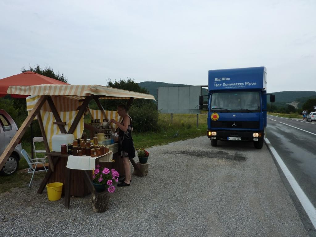 Irgendwo auf der Strecke finden wir einen Straßenstand, der neben Honig auch (Ziegen-) Käse verkauft. Natürlich kaufen wir einen Ziegenkäse. Aber es wird sich herausstellen, dass er a) nicht besonders schmeckt und b), dass es sich um Industrieware handelt. Denn jetzt kommen in kurzen Abständen immer neue Straßenstände, die Honig und Käse verkaufen, und es sind immer die identischen Sorten. Naja, da sind wir eben mal reingefallen. Aber am Gemüsestand vor Zadar sind wir erfolgreicher: wirklich leckere Honigmelone, Nektarinen und runter gesetzte Paprika. Hier stimmt der Preis und die Qualität.