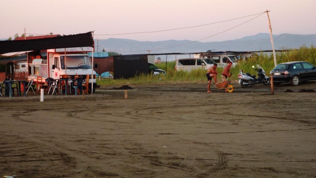 Wir nutzen die noch ertragbaren Temperaturen, mal den gesamten Strand abzugehen. Circa 2,5 Kilometer lang ist er fast überall im rückwärtigen Bereich mit Bars, Restaurants, Imbissbuden und Minimärkten bebaut. Nur einen richtigen Campingplatz suchen wir vergeblich. Und die Strandabschnitte vor den einzelnen Betrieben wird so behandelt, als seien sie deren Privatbesitz. Vollgestellt mit deren Liegen und Sonnenschirmen. Und es wird überall versucht, den am Strand geparkten Autos Parkgebühren abzuknöpfen. Diese „bewirtschafteten“ Strände sind – man staune – noch vor dem eigentlichen Ansturm der Gäste recht ordentlich gereinigt worden.