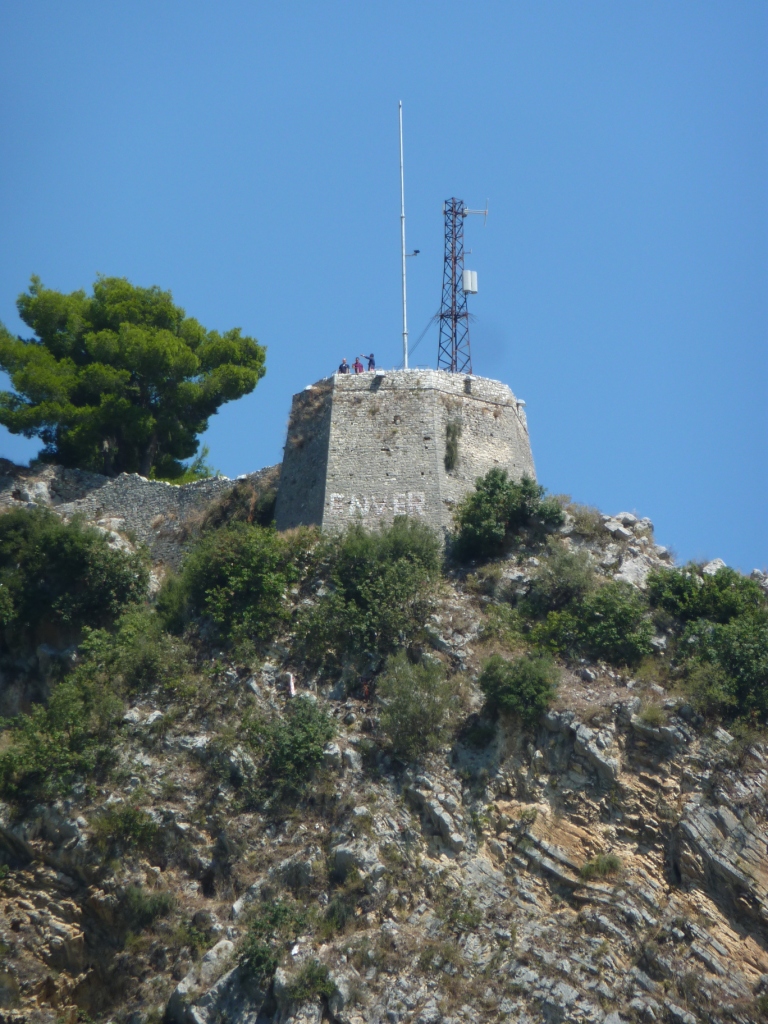 Beim Blick auf einen Wehrturm der Festug auf dem Berg können wir erkennen, dass es auch hier immer noch Freunde von Enver Hoxha gibt.