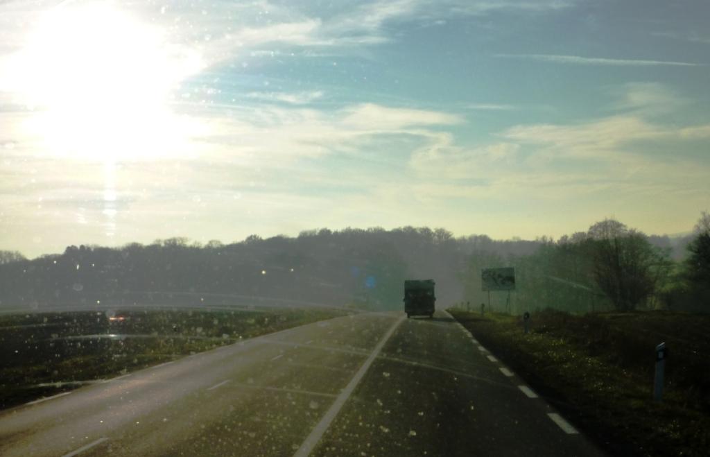 Dann immer stumpf durch den Nebel. Mal Wolfgang voraus: Er fährt nach Navi. Dann, wenn das Kartenlesen gefragt ist, da das Navi nicht immer das macht, was wir von ihm wünschen, fahre ich vorweg. So kommen wir dann recht gefrustet irgendwann kurz vor Belfort in das Doubstal.