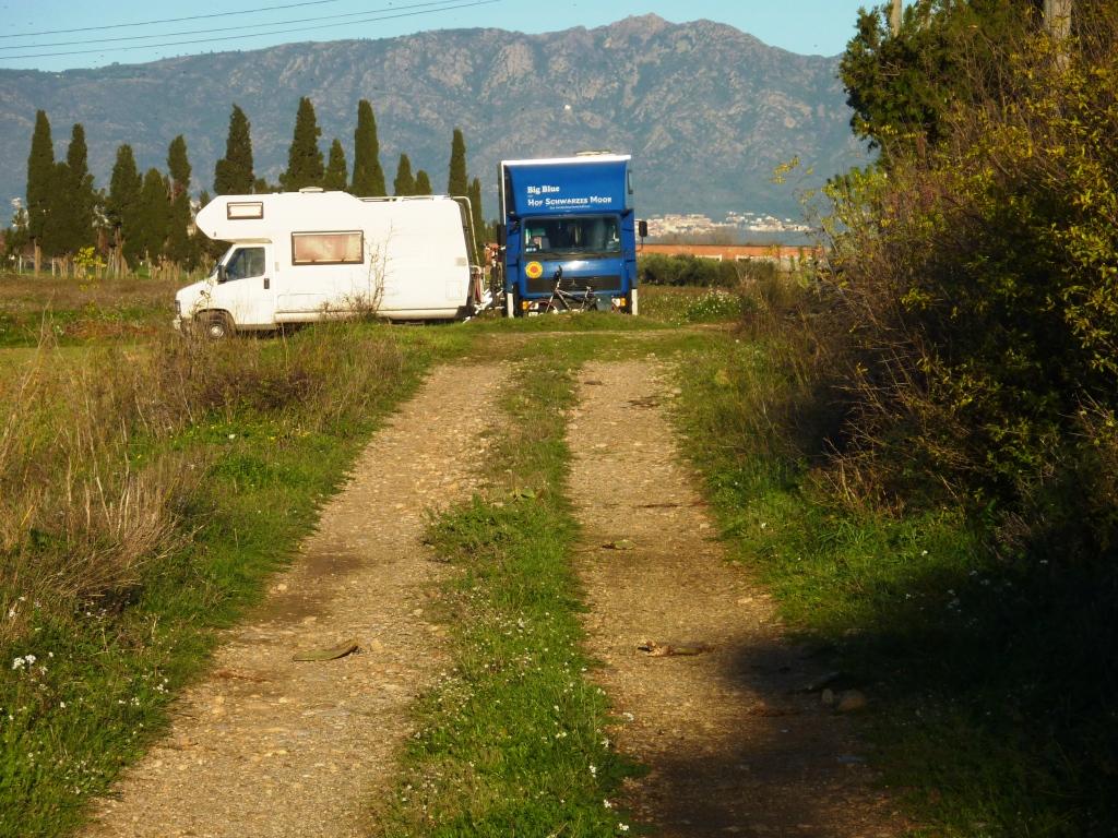 Schneebedeckte Gipfel blicken von oben auf uns herab. Unser Thermometer bleibt aber unverändert bei 22° Celsius. In La Jonquera muss ich tanken. An der ersten Tankstelle bleibe ich ohne Erfolg. Komme mit der Technik nicht klar. An der zweiten verzweifele ich auch fast. In letzter Sekunde sehe ich dann aber ein Schild an der Eingangstür, dass man hier erst bezahlen muss, und dann erst wird die Säule freigeschaltet. Was die wohl machen, wenn man mehr Diesel zum Tanken angibt als dann tatsächlich rein passen? Ob es dann Kohle zurück gibt? Und wenn ja, wie die das wohl dann mit Kreditkartenzahlungen machen? Keine Ahnung. Aber die angeforderten 130 Liter passen rein. Richtung Figueres fahren wir auf der Nationalstraße neben der Autobahn. Mautfrei. Denn in Spanien langen die richtig hin. Die Strecke heute in Frankreich war von Preisleistungsverhältnis in Ordnung. Auf der Umgehung von Figueres fahre ich leider eine Kreuzung zu früh Richtung Küste ab. So muss ich mich dann mit meiner alten Michelin Karte über kleine Straßen Richtung Fortia durchmogeln. Da die Adresse des angepeilten Campingplatzes weder von Google Maps noch vom Wolfgangs TomTom gefunden wird, müssen wir uns mit einer recht wagen Wegbeschreibung auf MeinWomo.net zufrieden geben. Aber das klappt. Nur errreichen wir  den Campingplatzbesitzer lediglich per Handy, denn er ist zurzeit auf dem Flughafen von Barcelona auf dem Weg nach München. Er verspricht uns, dass sein Schweigersohn gegen 18:00 Uhr am Platz sein wird und uns rein lässt.