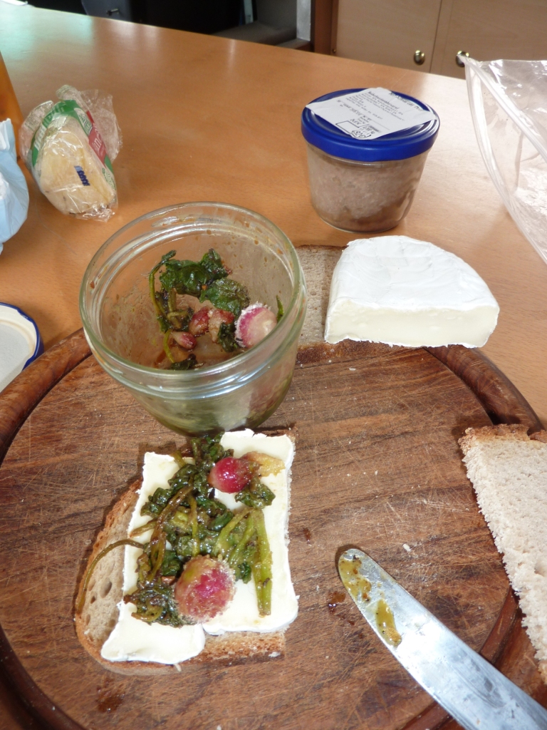 Noch ein paar Klamotten und noch ein bisschen zu Essen. Heidi hat noch ein paar Radieschen für mich geerntet und das Grünzeug davon in etwas Öl in der Pfanne angebraten. Das ganze kleingeschnitten und als eine Art Pesto in ein Glas abgefüllt. Schmeckt mir total gut.
