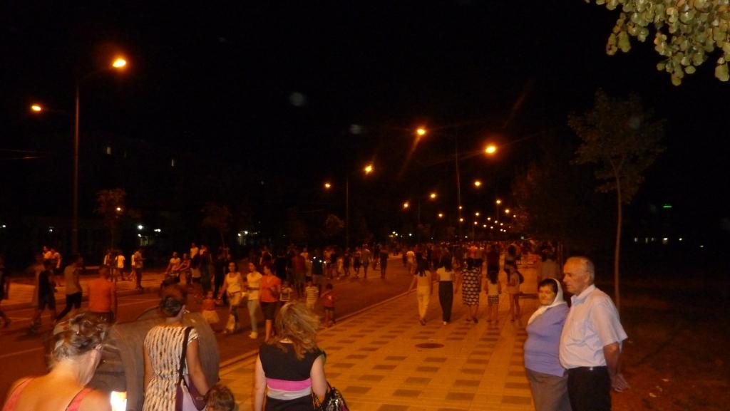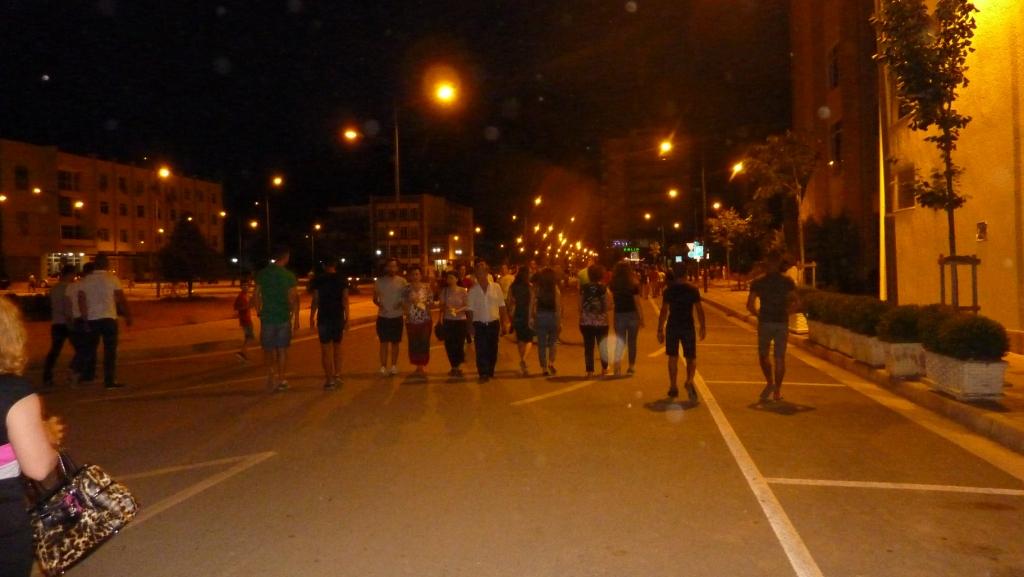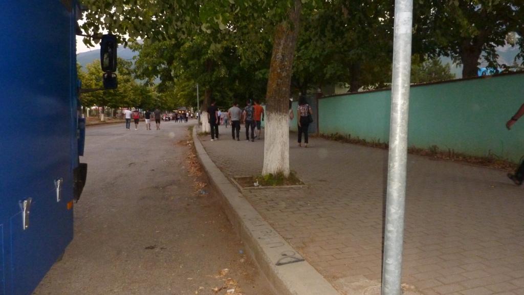 Als wir zu Big Blue zurück kommen und ein bisschen Pause einlegen wollen, so gegen 18:00 Uhr, laufen immer mehr Menschen an uns vorbei. Schick gemacht für den Feierabend. Ein 15-jähriges Mädchen klärt uns auf: Jeden Abend ist die Hauptstraße von 18:00 bis 23:00 Uhr für den Autoverkehr gesperrt und die ganze Stadt geht promenieren. Jeden Abend!!!! Wir gehen mit der Kleinen mit. Sie erzählt uns in bestem Englisch, dass die in Mazedonien geboren ist, hier zur Schule geht, ihr Bruder seit seinem 16-ten Lebensjahr in Dortmund in einer Kneipe arbeitet. Sie erklärt uns viel über die mögliche Schulbildung hier im Land und der Erkenntnis der Jugendlichen und deren Familien über die Wichtigkeit einer guten Ausbildung.