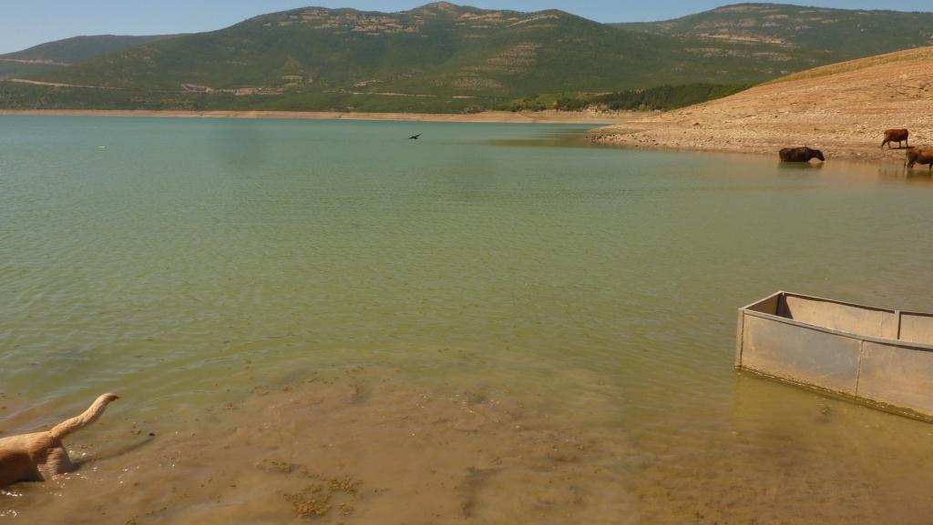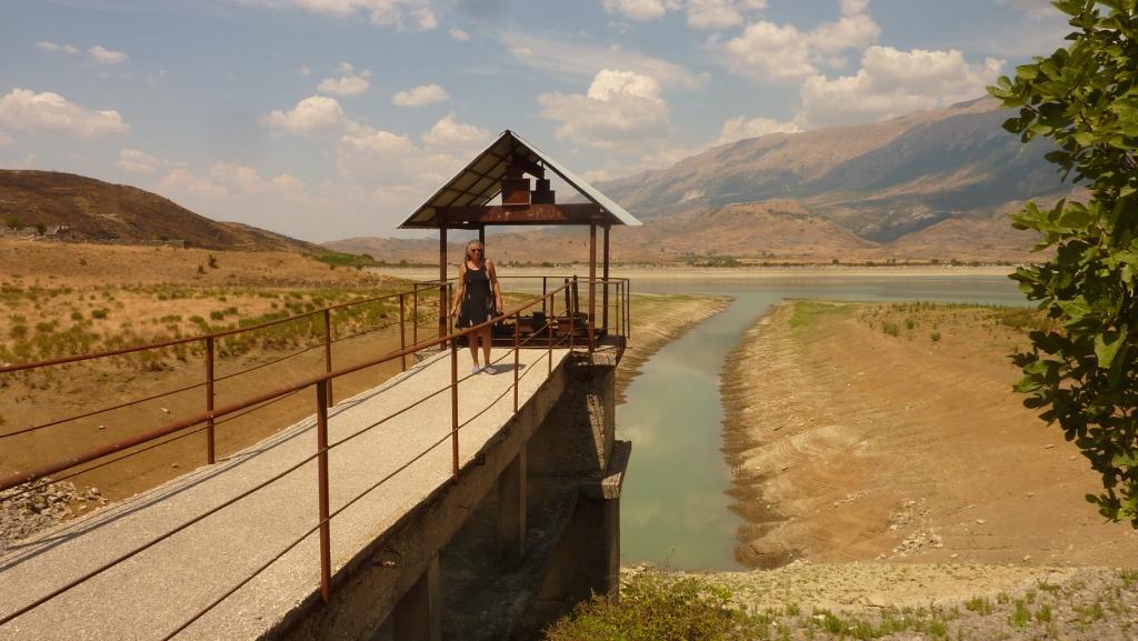Hier soll unser erster Stopp dieses Jahr sein. Schon viel über diese Stadt im ärmsten Teil Albanien gelesen und gehört. Für uns ist der größte Schock, als wir um die Ecke kommen, im riesigen Stausee fehlen mindestens zehn Höhenmeter an Wasser. Hier im Stadtbereich kein Herankommen an das kühlende Nass. So lassen wir Big Blue erst einmal an einer großen Tankstelle an der A1 stehen und wursteln uns zu Fuß an die Wasserlinie durch. Für Lara, die das auch dankend annimmt mal wieder zwischen Kühen zu baden.