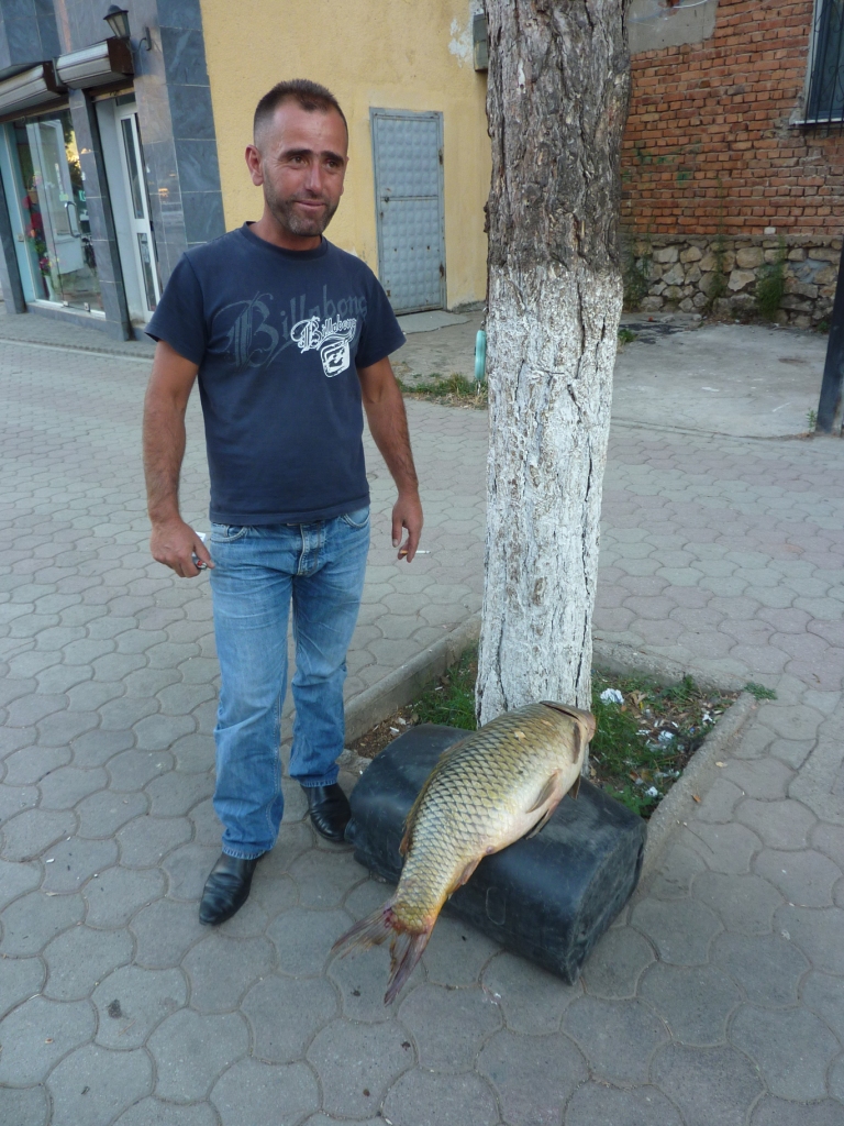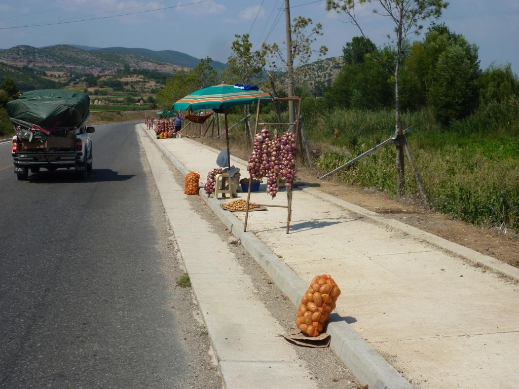 Wir kommen wieder an den vielen Ständen der Straßenhändler vorbei. Hier werden eigentlich nur Zwiebeln angeboten. Das muss hier ein Zwiebelgebiet sein. Vereinzelt gibt es auch Tomaten und Paprika. Und ein Fischstand. Fisch wird hauptsächlich südlich von unserem Campingplatz Rei in Richtung Pogradec offeriert. Da wir uns schon gestern dazu entschieden haben, hier nicht selbst zu kochen sondern die Küche des Rei zu genießen, schaffen wir es bis nach Lin ohne Shopping.