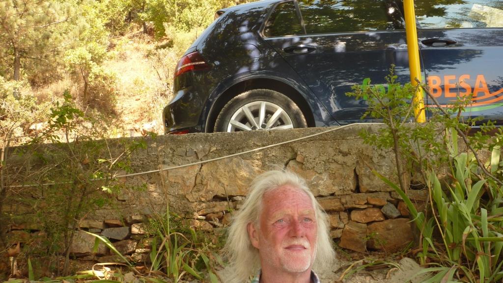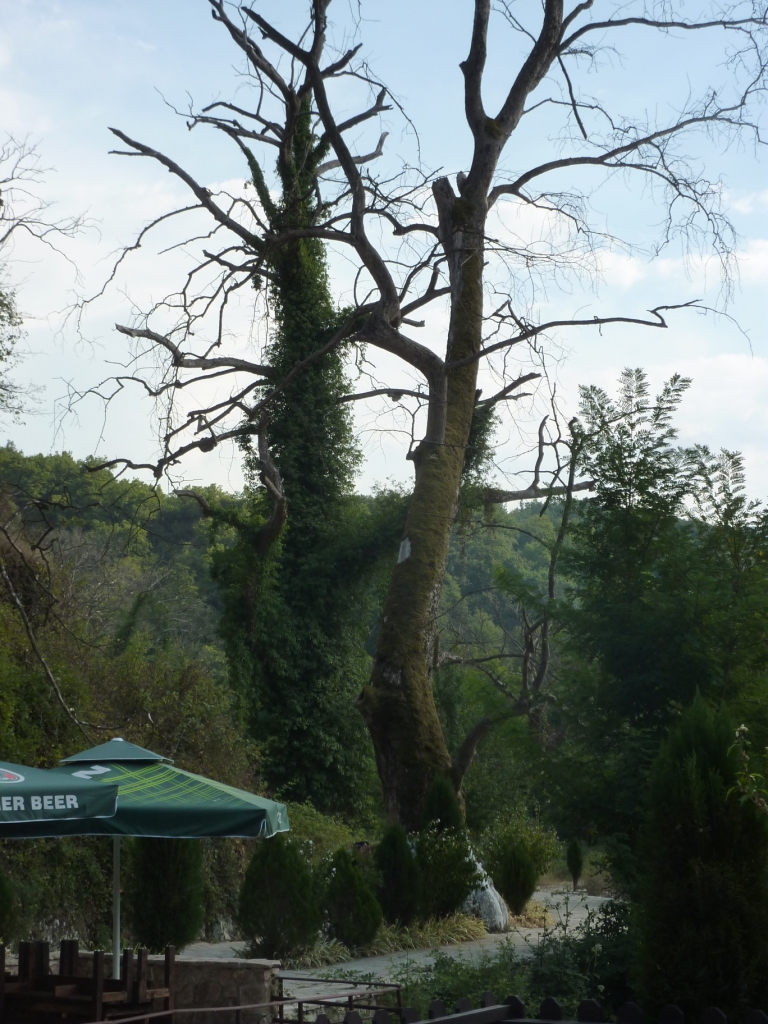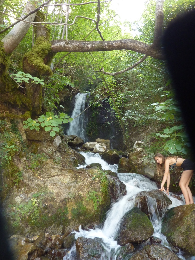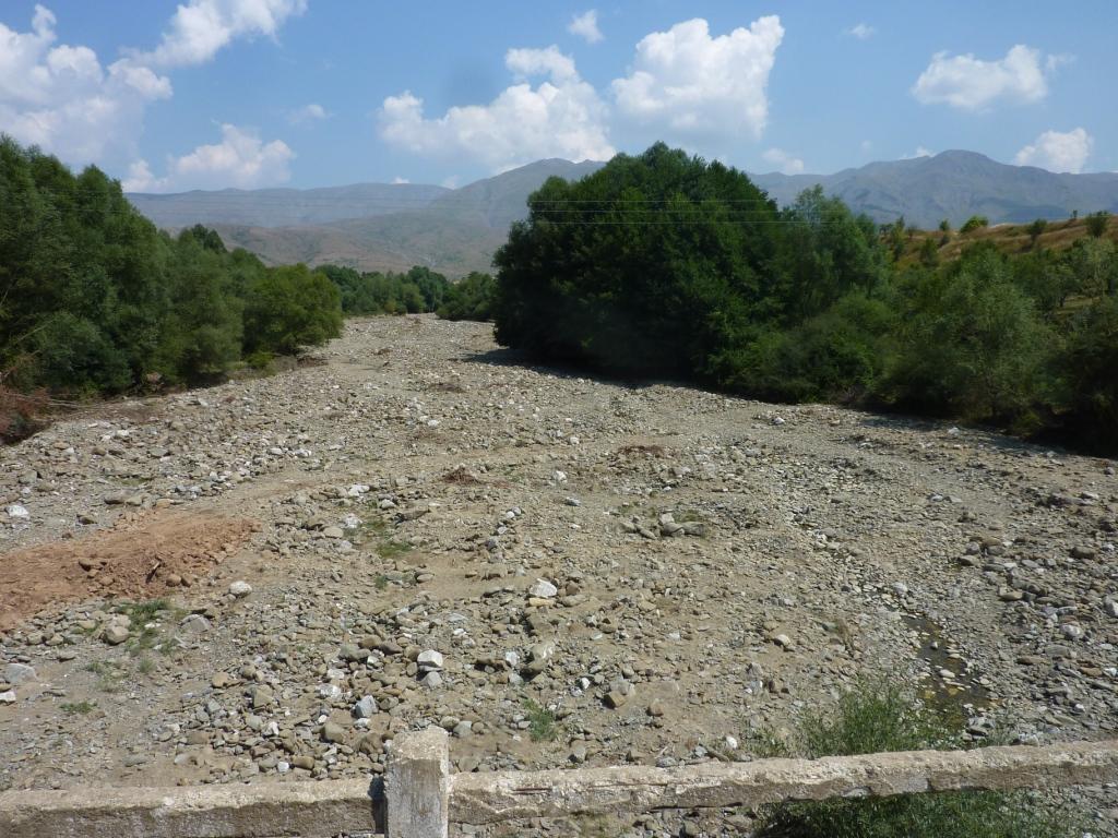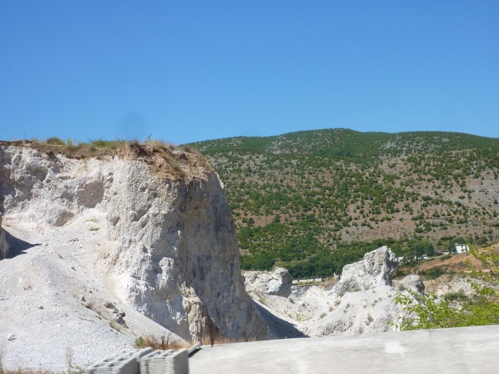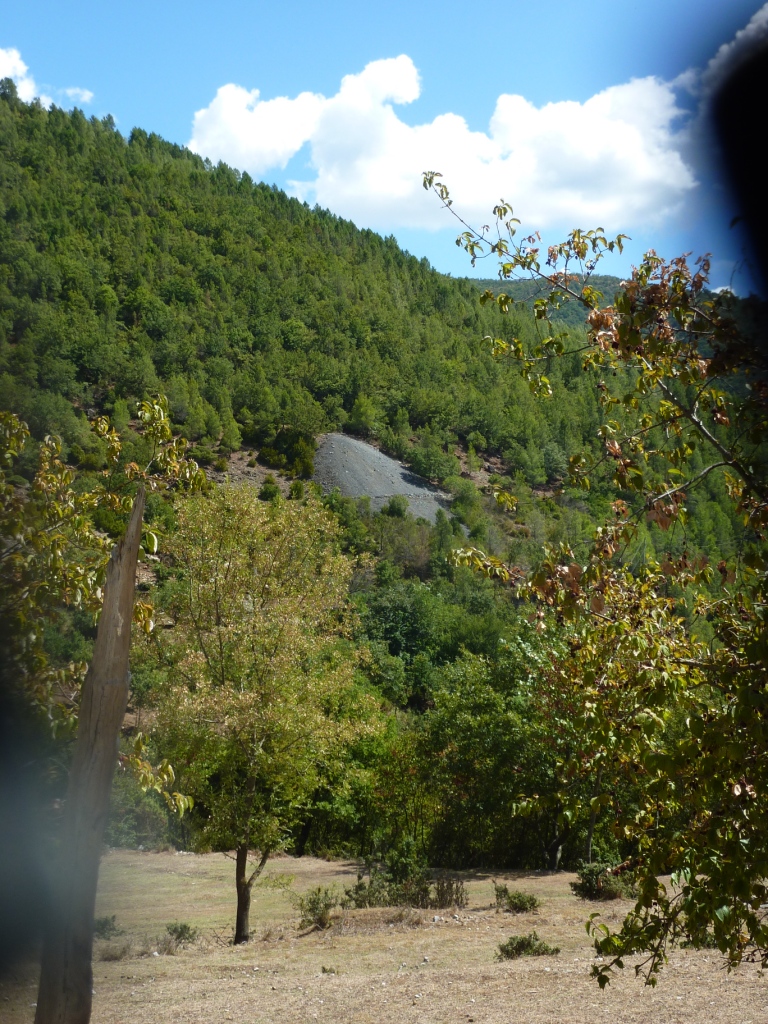 Am späten Vormittag suchen wir die überall angekündigte Schwefelheilquelle. Wir finden sie dann bergauf fasst am Ende der Straße, an dem auch unser Campingplatz liegt. An einem kleinen Bach links ab. Dann wirklich sehr attaktiv: Der Bach wird zur Müllkippe. Weiter bergauf, vorbei an Müll und an einem neu aufgeschütteten Plateau. Dort soll wohl mal ein Hotel entstehen. Über den Hang des Plateaus kann man einen schwefeligen Abfluss erahnen. Und so ist es dann auch. Die eigentliche Quelle ist durch die Anlage des Bauplatzes zerstört. Das Schwefelwasser wird in einer kleinen provisorischen Rinne hinter dem Gelände herumgeleitet. Es gibt keine Möglichkeit in das Wasser zu gehen, weder mit den Füßen noch ganz. Kein Vergleich mit den Quellen in Benjë-Novoselë im letzten Jahr.