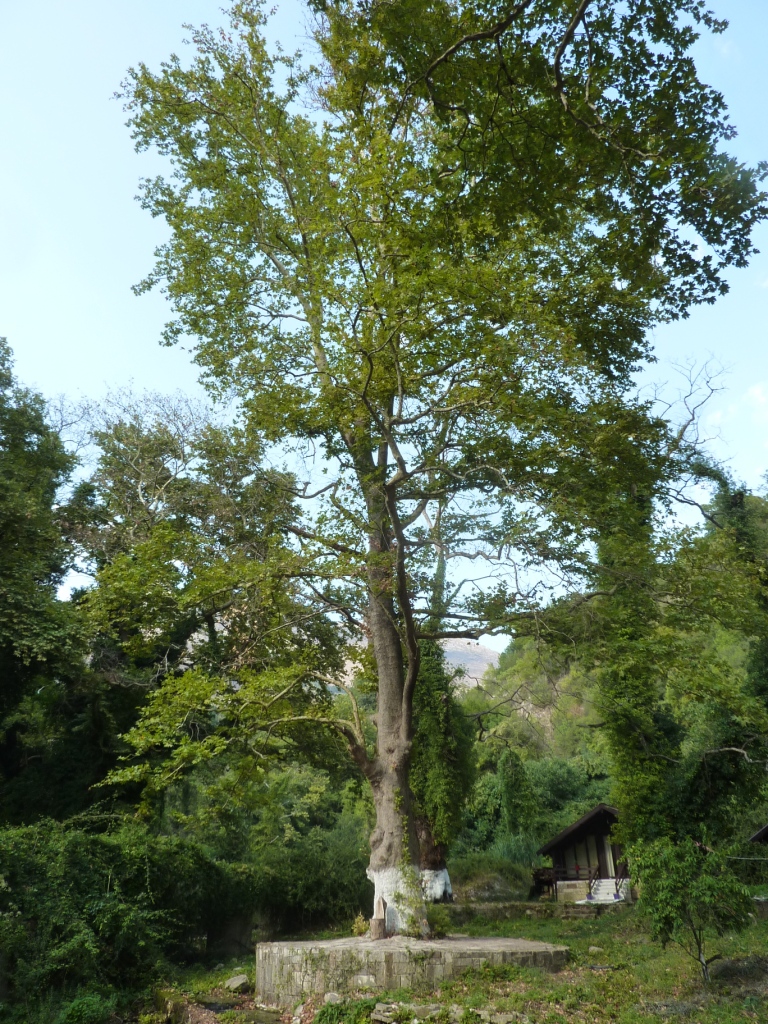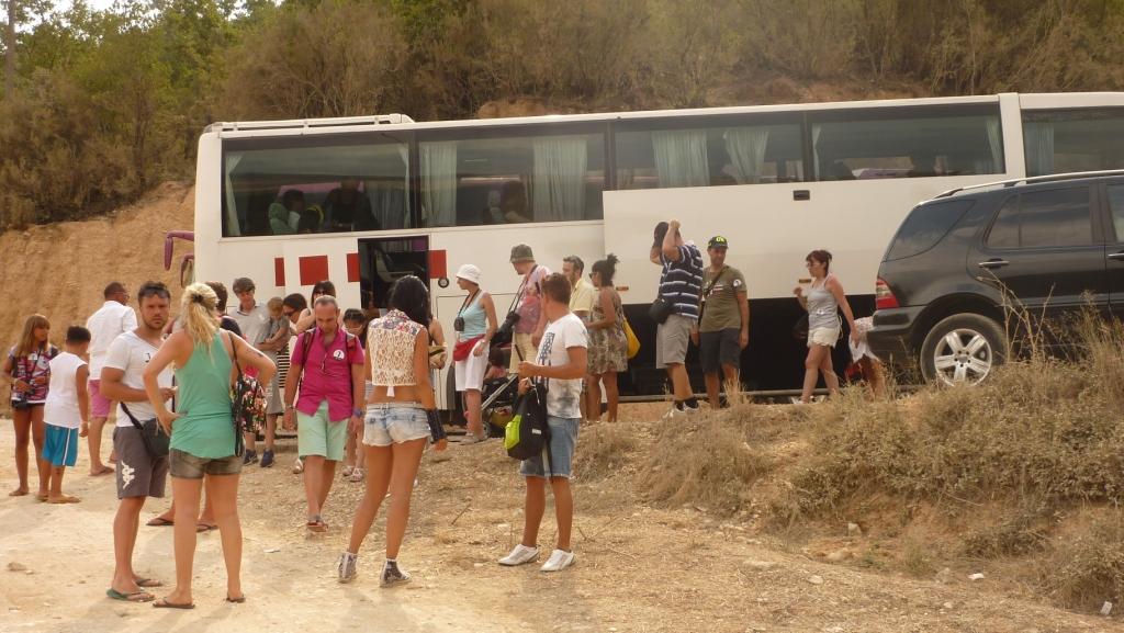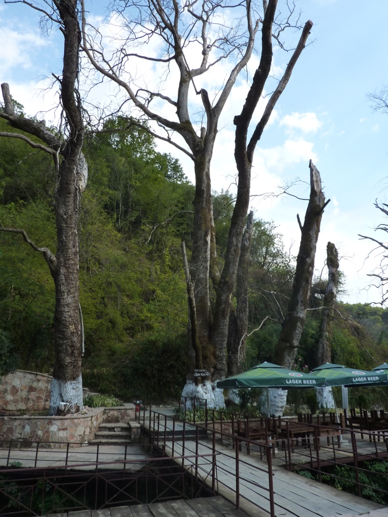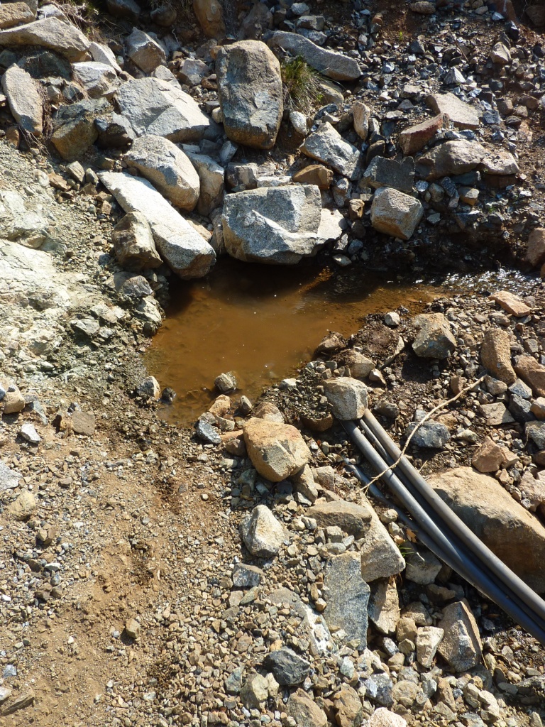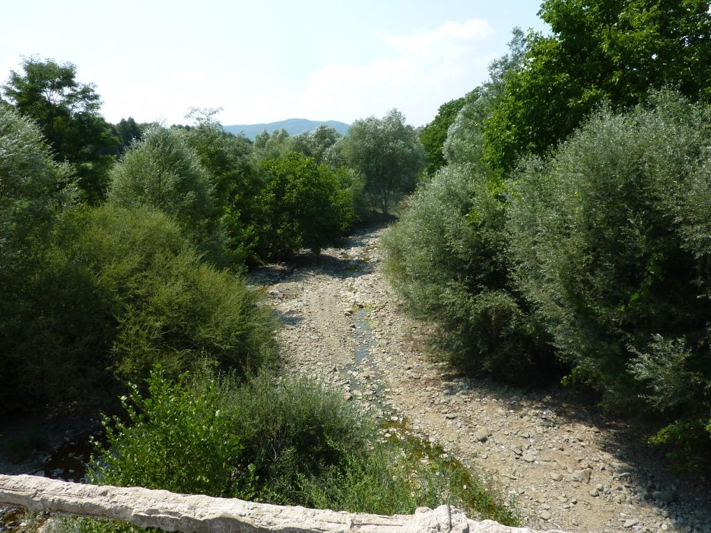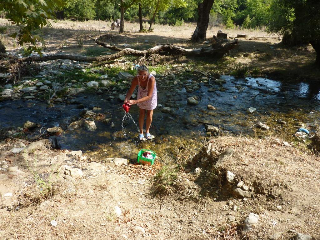 Am späten Vormittag suchen wir die überall angekündigte Schwefelheilquelle. Wir finden sie dann bergauf fasst am Ende der Straße, an dem auch unser Campingplatz liegt. An einem kleinen Bach links ab. Dann wirklich sehr attaktiv: Der Bach wird zur Müllkippe. Weiter bergauf, vorbei an Müll und an einem neu aufgeschütteten Plateau. Dort soll wohl mal ein Hotel entstehen. Über den Hang des Plateaus kann man einen schwefeligen Abfluss erahnen. Und so ist es dann auch. Die eigentliche Quelle ist durch die Anlage des Bauplatzes zerstört. Das Schwefelwasser wird in einer kleinen provisorischen Rinne hinter dem Gelände herumgeleitet. Es gibt keine Möglichkeit in das Wasser zu gehen, weder mit den Füßen noch ganz. Kein Vergleich mit den Quellen in Benjë-Novoselë im letzten Jahr.