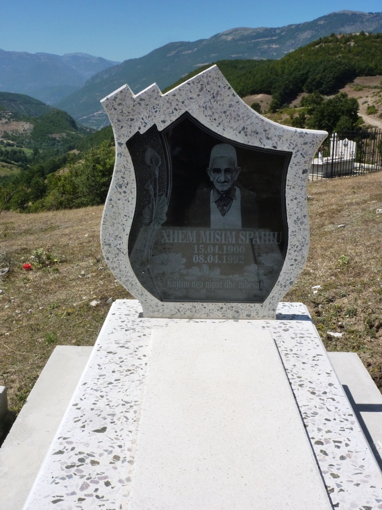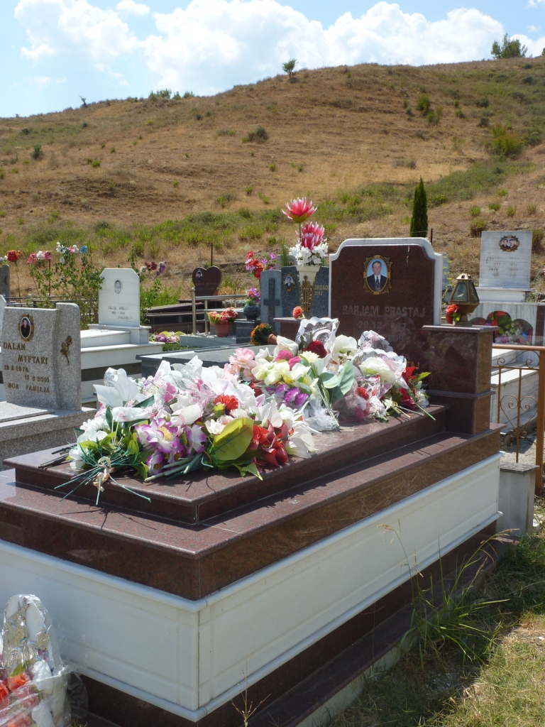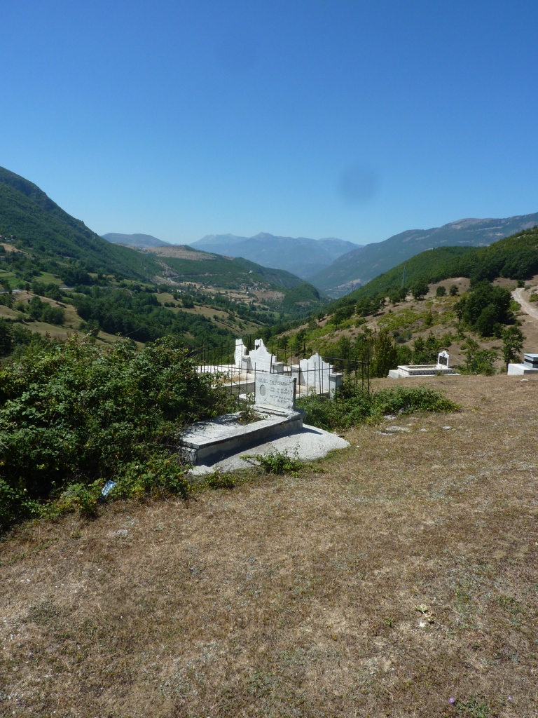 Außerhalb der Grenzen von Kukës kommen wir dann schnell in der Realität an. Hier fehlen Wegweiser und Ortschilder komplett. Die Straße ist gut. Und es geht gleich richtig hoch. Und wieder runter. Und wieder hoch. Auf der ersten Höhe finden wir einen typischen Friedhof.