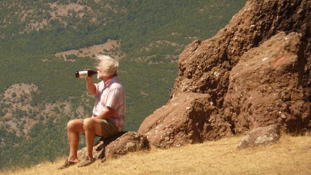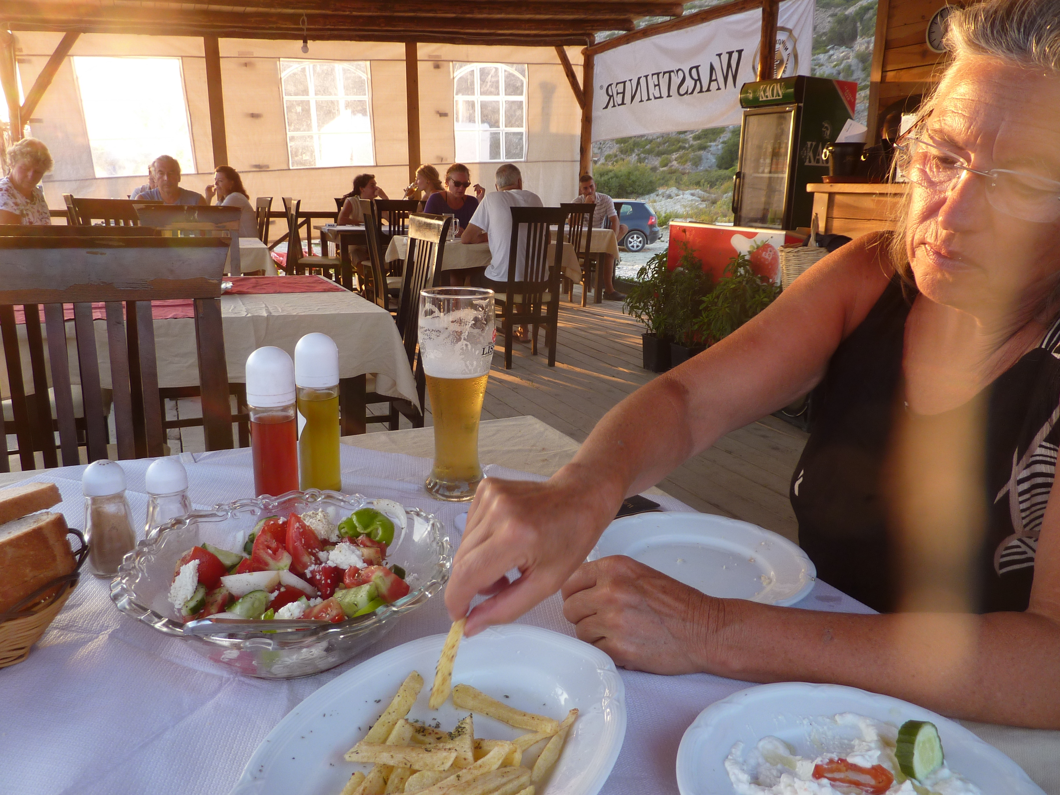 Bei Helmes, Kurz vor Mollas, haben wir vor, eventuell an einem östlich von der SH75 gelegenen See Rezervuari i Mollasit Pause zu machen und zu übernachten. Aber der See ist, wie viele dieses Jahr, nahezu trocken gefallen und daher nicht besonders einladend. An der Stelle, an dem der Feldweg zu dem See von der Hauptstraße abzweigt, steht ein sehr schön gestaltetes Restaurant mit ansprechendem Gartenambiente und eigenen Tieren. Zu dem Anwesen gehört ein ganz neu angelegter Campingplatz Sofra Kolonjare. Leider ist an den Albanern scheinbar wirklich vorbeigegangen, dass Wohnmobile heute sehr häufig höher als 2,60 Meter sind. So endet diese Übernachtungsalternative am schönen „Bonanzator“. Wir haben auch noch nicht für eine Outdoor Übernachtung eingekauft. Und ohne Bier gehen Heidi und Stephan nicht ins Bett!