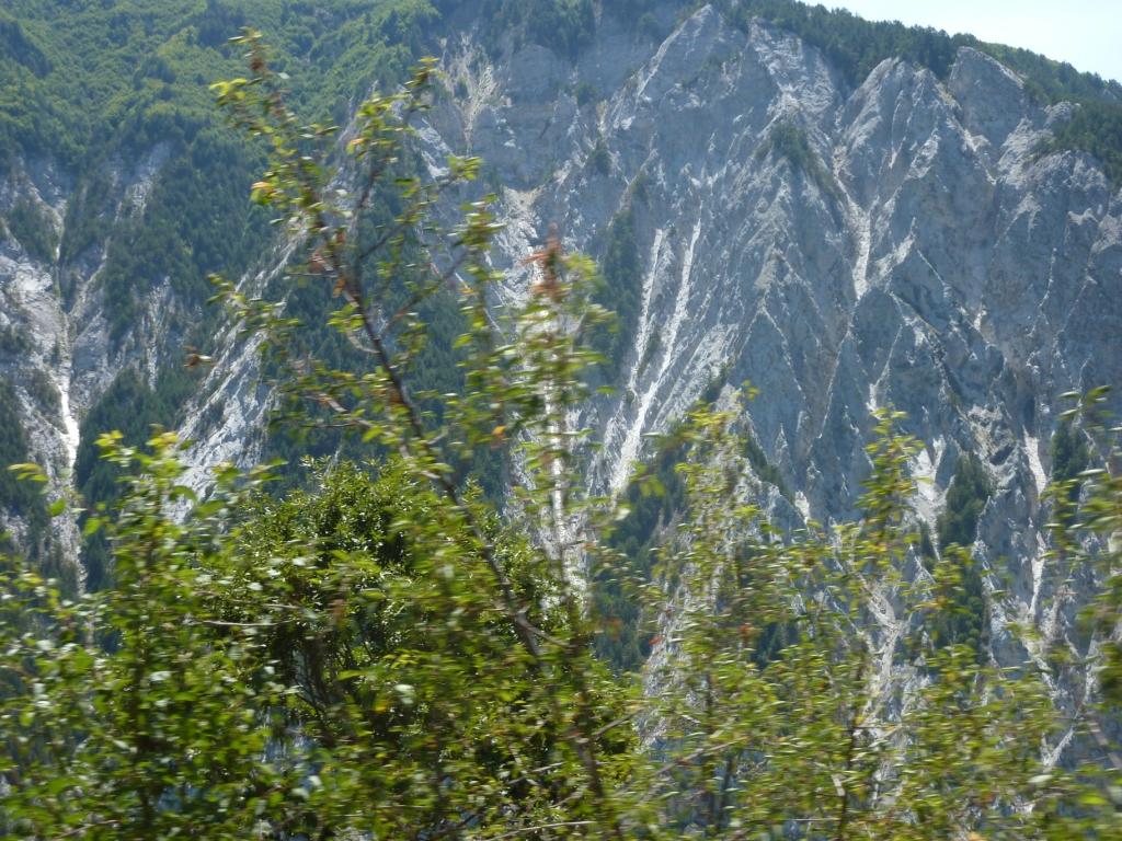Wir entscheiden uns aber dagegen. Heidi möchte heute Abend Fleisch und wir haben noch nicht genug Bier im Auto. Und Trinkwasser geht eventuell zur Neige. So fahren wir weiter durch ein wunderbares Bergpanorama. Die Straße immer noch gut. Wenn man von den albanientypischen Fahrbahnabsenkungen oder ‑abbrüchen absieht.