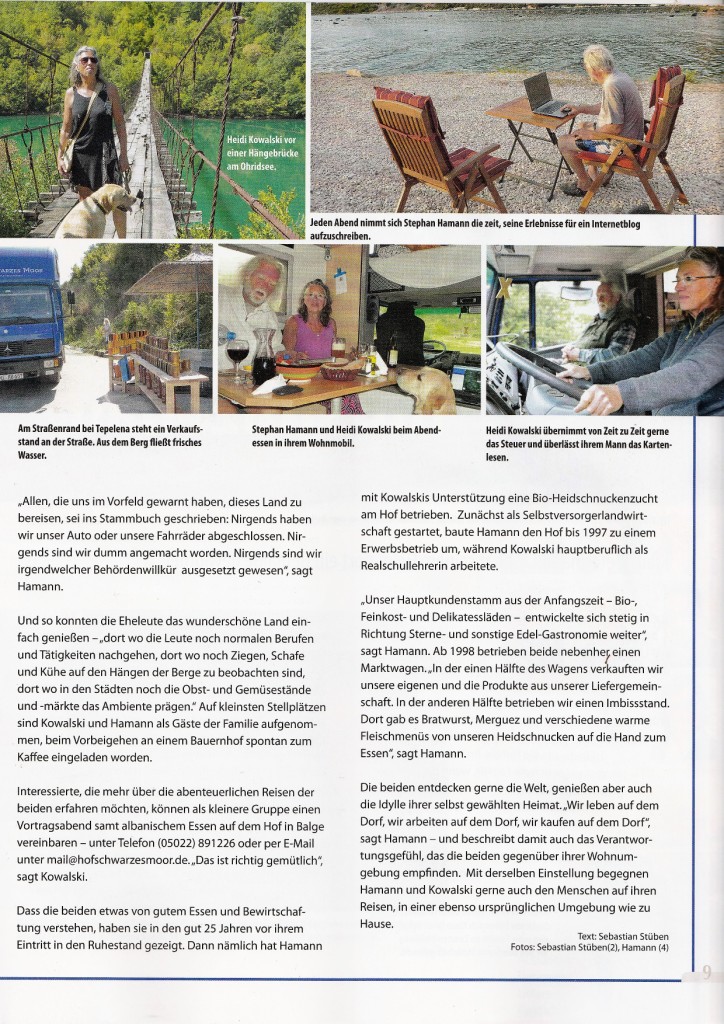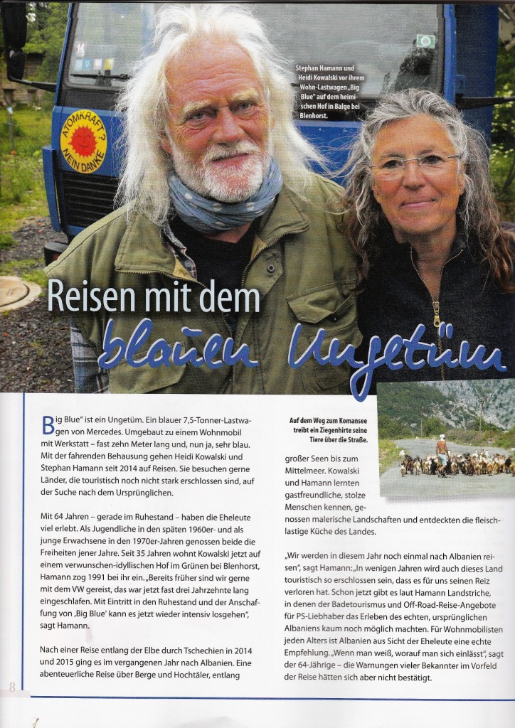 Und dann bekommen wir von unserem heiß geliebten Nachbarn Peter einen Zeitungsartikel zugemailt, der am 2017-08-05 in der Lebenslust als Leitartikel veröffentlicht wurde. Er handelt unter Anderem von unserer Albanienreise. Nicht von dieser, sondern der vom letzten Jahr