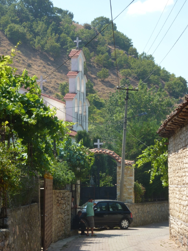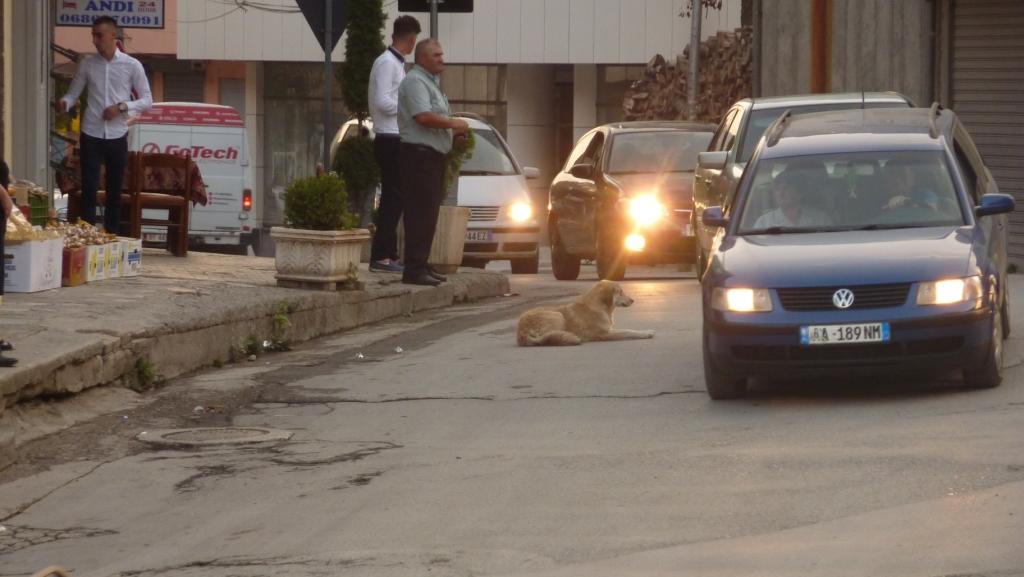 Aber vorher gehen wir noch in den Ort. Wie auch schon in Kukës schlägt hier originäres albanisches Leben zu. Auf der Hauptautostraße alles an Geschäften, die man braucht um sich durchs Leben schlagen zu können. Und dann gibt es auch noch eine groß angelegte Fußgängerzone, die teilweise noch in Arbeit ist. Man könnte sagen, hier ist es schon etwas touristischer. Aber wir finden kaum welche. Gut, es gibt einen Hinweis auf ein Backpacker Hostel. Aber wo sind die Backpacker?