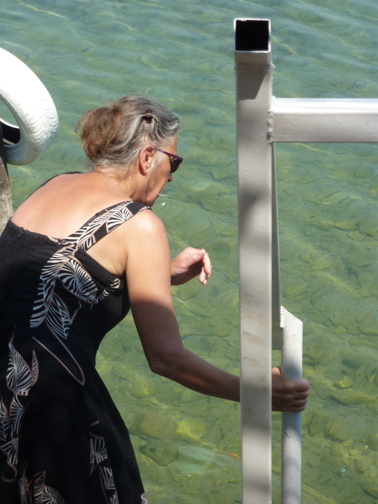 Die Wetterverschlechterung, die im Wetterbericht vorausgesagt ist, tritt nicht so ein. Es ist zwar kühler und nicht mehr durchgehend wolkenlos. Für mich ist das Wasser immer noch warm genug.