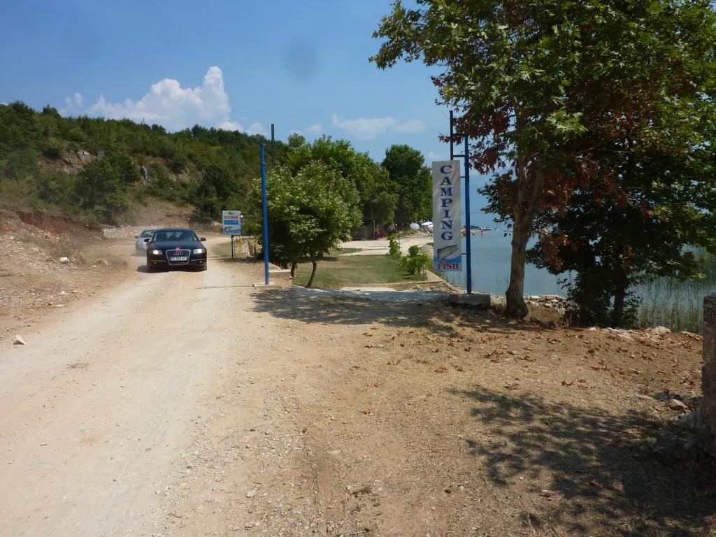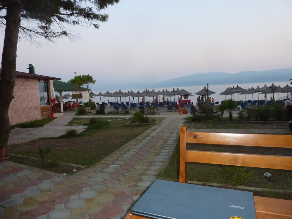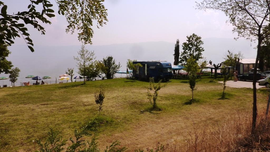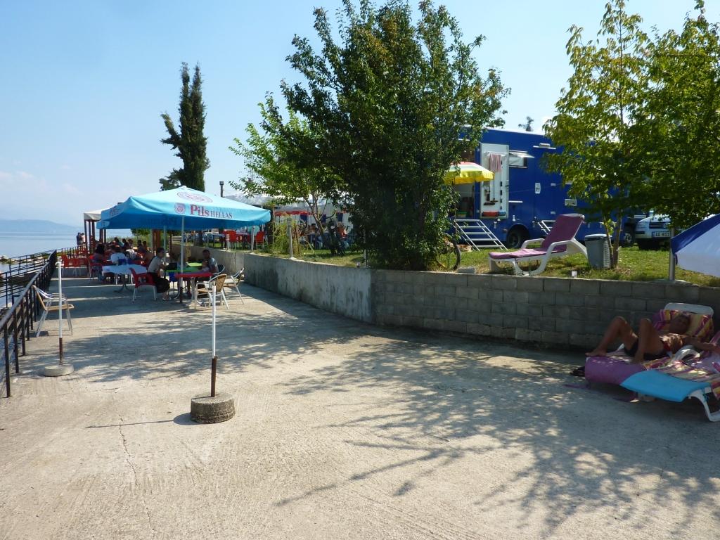 Dann geht’s runter auf der neuen Straße von Tirana über Elbasan nach Pogradec zum Ohridsee. Vierter Gang und Backstein auf die Motorbremse. Links liegt Lin. Auf der EU-geförderten Straße fehlt immer noch die Verschleißschicht. Aber die ärgsten Löcher vom letzten Jahr sind verschlossen worden. Dann kommt unser Ziel in Sicht. Blinker links und rauf. Direkt neben den Pavillons rückwärts rein und ab ins Wasser. Dann bei den Jungs vom Platz vorbeigeschaut. Sie erkennen uns wieder, fragen wie es uns geht und was wir trinken wollen. Sie freuen sich scheinbar genauso über uns, wie wir uns freuen hier wieder zu Gast zu sein.