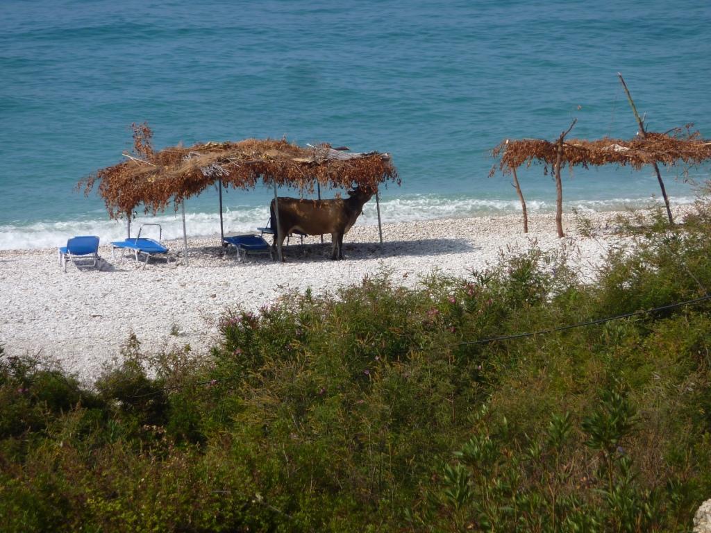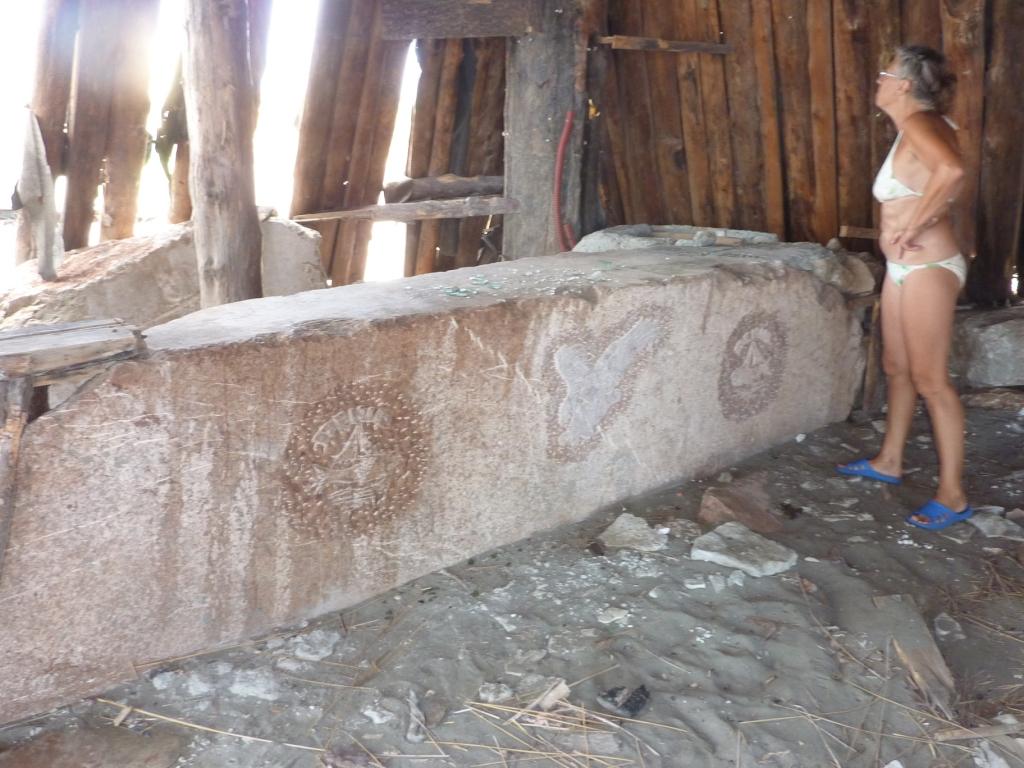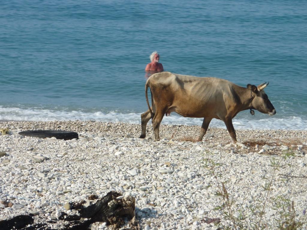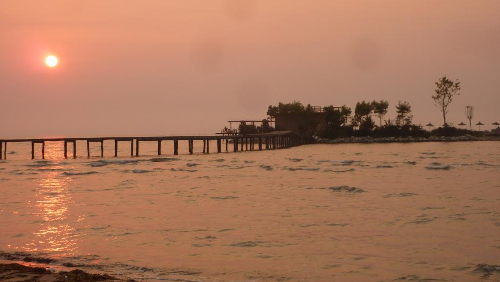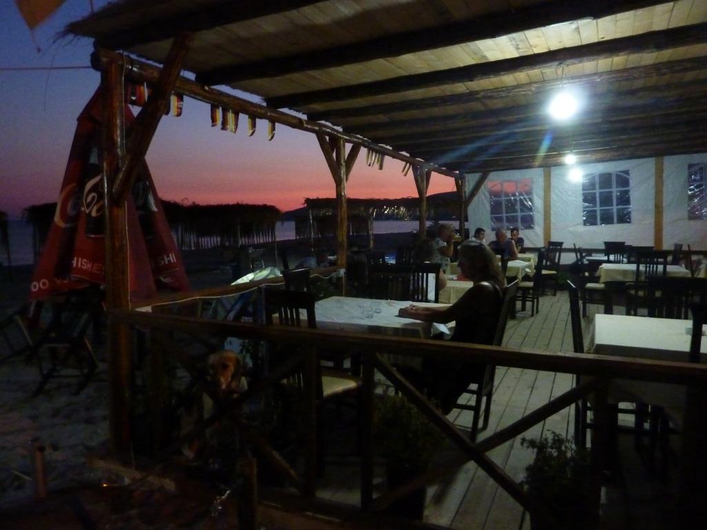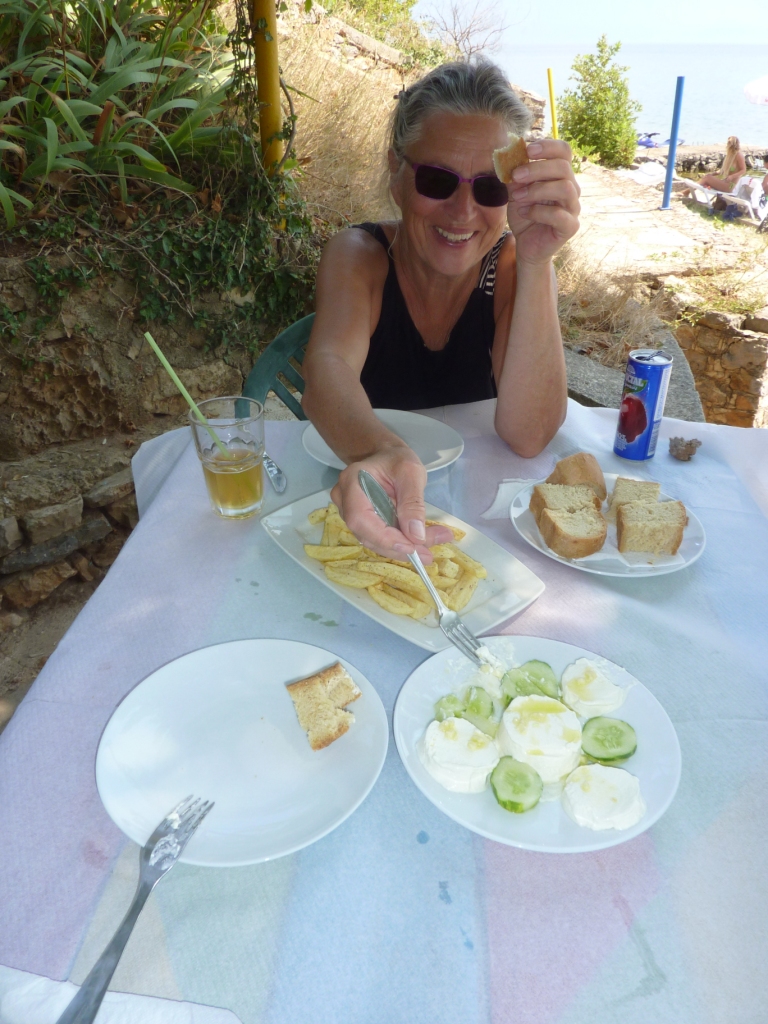 Aber ich will dieser Ort nicht ganz schlecht schreiben. Denn hinter dem Campingplatz ist auf der rechten Seite ein kleines Restaurant. Das ist wirklich gut. Man sitzt unter Wein und Bäumen im Schatten, kann den Strand beobachten (als wir hier sind wurde hier wohl gerade ein Trailer für einen Softporno gedreht) und lecker essen. Hier haben wir ein für uns neue Form des Tsatsiki kennengelernt.
