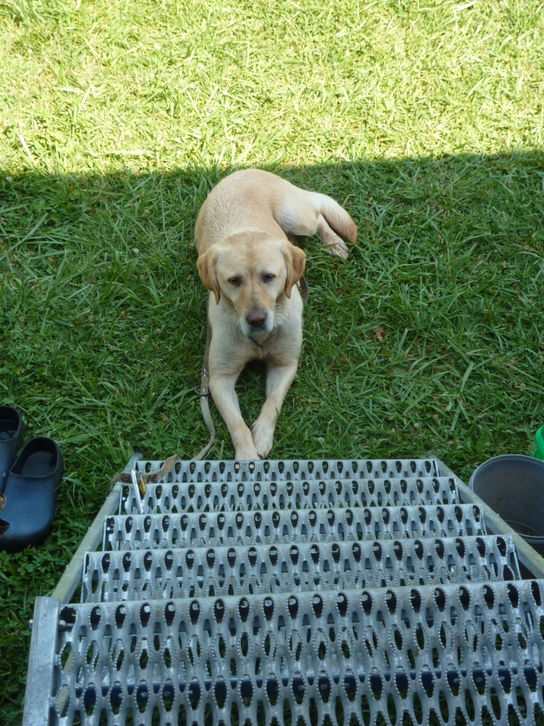 Diese Routine wird jäh unterbrochen. Auf dem Weg zum Wasser wird Lara von einer Katze, die ihr Junges bewacht, aus heiterem Himmel angegriffen. Lara weiß sich nicht zu verhalten, denn ihr Fletschen und Abwehrbeißen bringt keinen Erfolg. Ich lasse sie frei, damit sie sich richtig wehren kann. Sie ergreift sofort die Flucht und versucht sich in Big Blue in Sicherheit zu bringen. Ein auf Katzen bezogen völlig ungewöhnliches Verhalten. Sonst sind die Katzen die Leidtragenden solcher Begegnungen. Mal sehen, ob wir das noch einmal im Foto festhalten können.