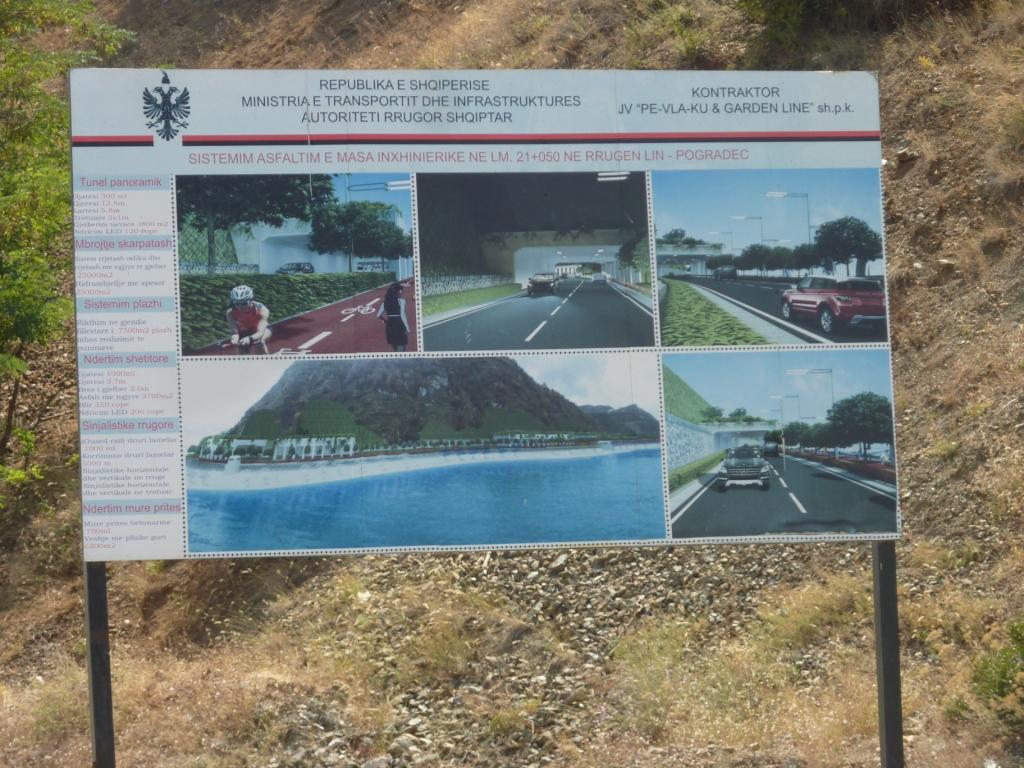 • Am Ortseingang nach Pogradec wird gebaut. Im großen Stil wird hier der Berg abgetragen um die Straße neu in einem Tunnel zu verlegen. Diese Baustelle gab es schon letztes Jahr. Sie sind ein bisschen weiter gekommen. Aber mir fällt dieses Jahr vor allem das Bauschild auf: Die Albaner bauen an ihrer Zukunft.