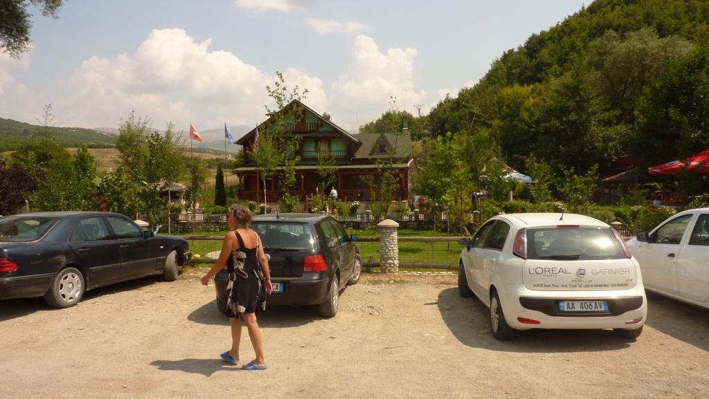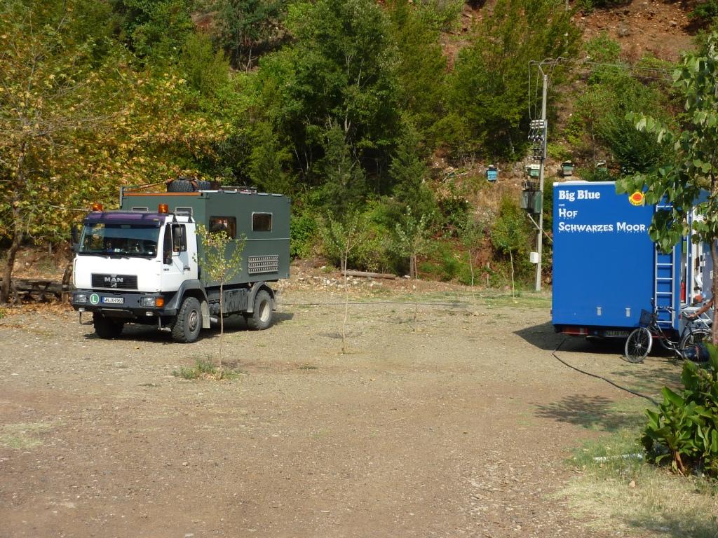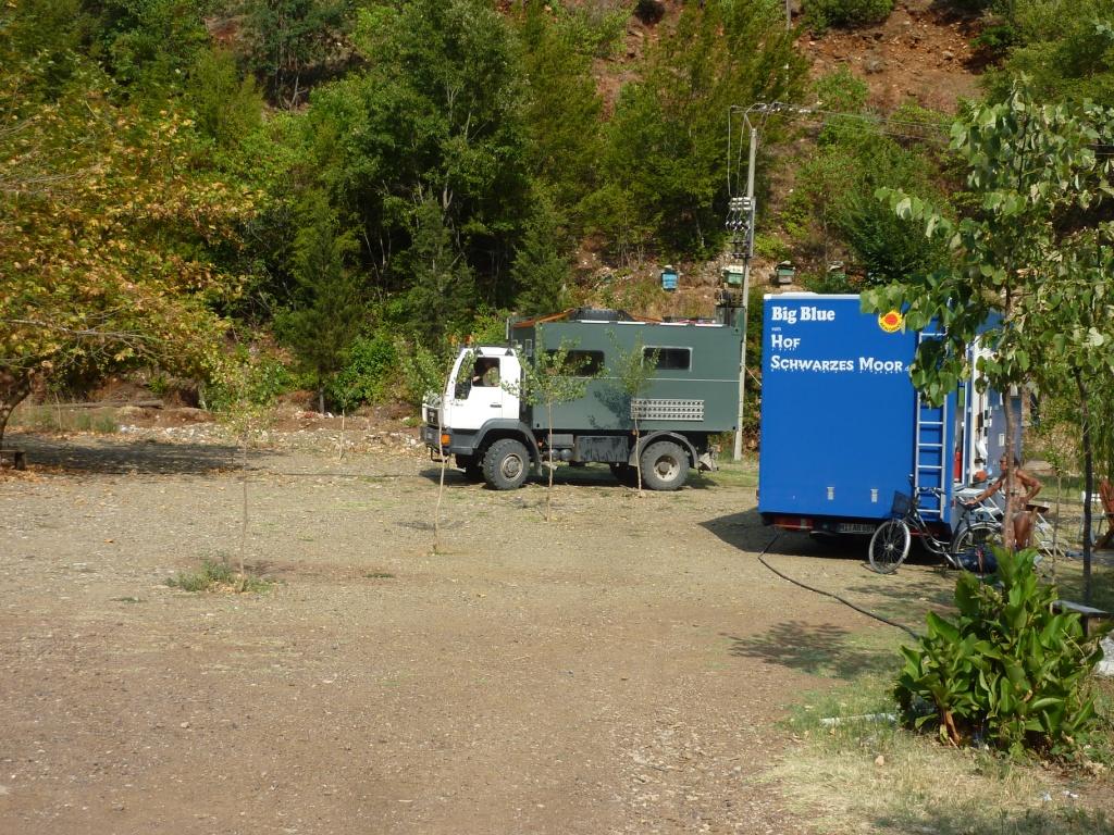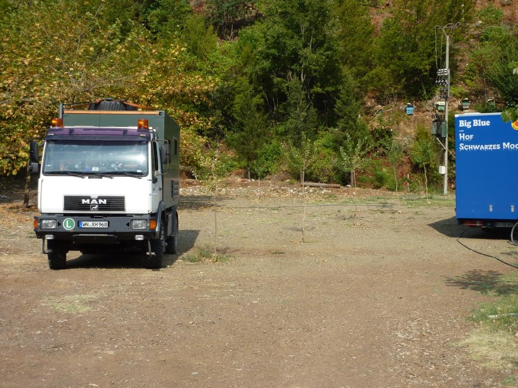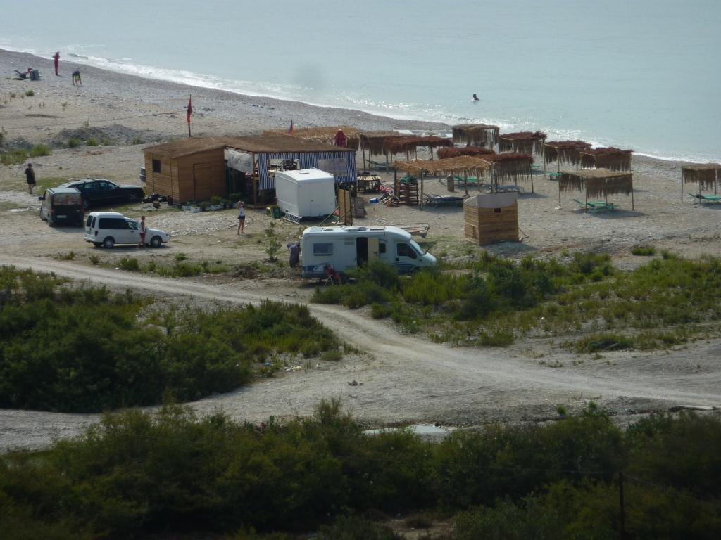 Der Betreiberin ist das alles sehr peinlich. Sollte es auch. Denn wir haben sicherlich viel Verständnis dafür, dass hier nicht alles perfekt ist. Das macht ja auch den Reiz Albaniens aus. Aber die Höhe seiner Einfahrt sollte man doch kennen. Vor allem, weil hier schon häufiger hohe (Allrad-) Fahrzeuge drin waren, die sicherlich auch so um die 3,60 Meter Höhe hatten. Also unser Tipp: Hier nur mit Karossen, die nicht länger als 8,00 Meter und nicht höher als 3,50 Meter sind. Dann steht man hier wirklich wunderschön zwischen Weinreben und einem Gemüsegarten. Die Familie gibt sich wahnsinnig viel Mühe, einem jeden Wunsch von den Augen abzulesen und für diese arme Region hat dieser Platz gute Sanitäranlagen. Es gibt Kinderbespaßungsinstallationen, überdachte Sitzgruppen und man kann den Grill benutzen. Und wir haben oben auf der Straße auch nicht schlecht geschlafen.