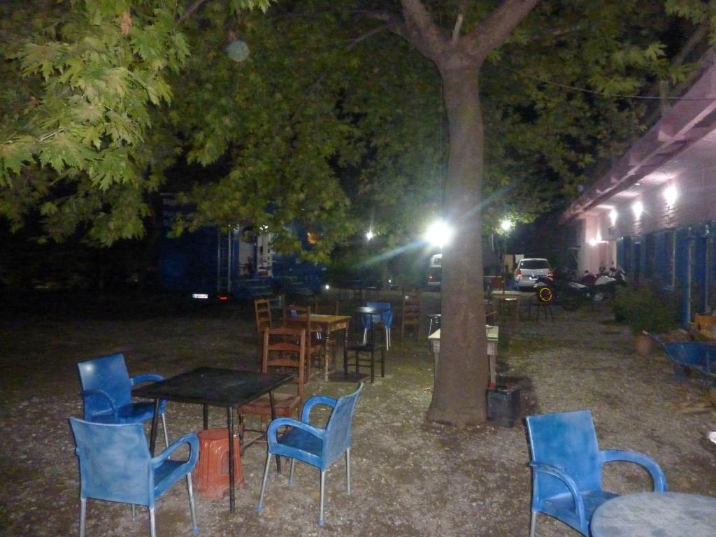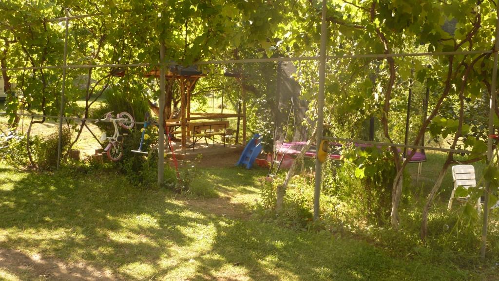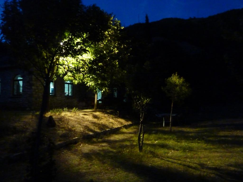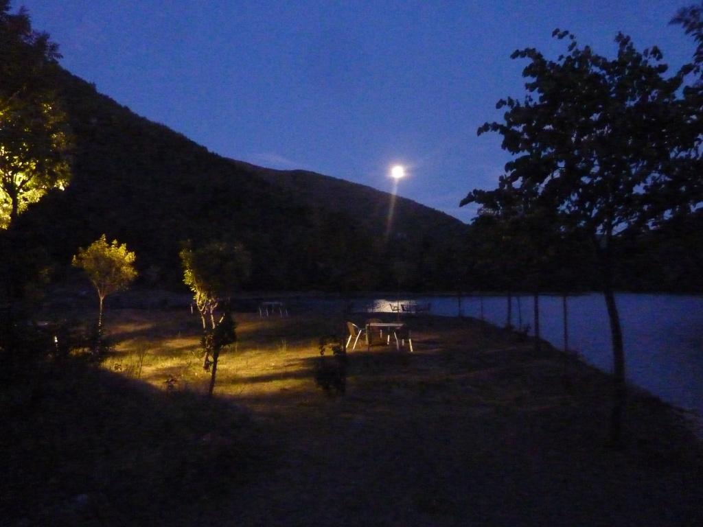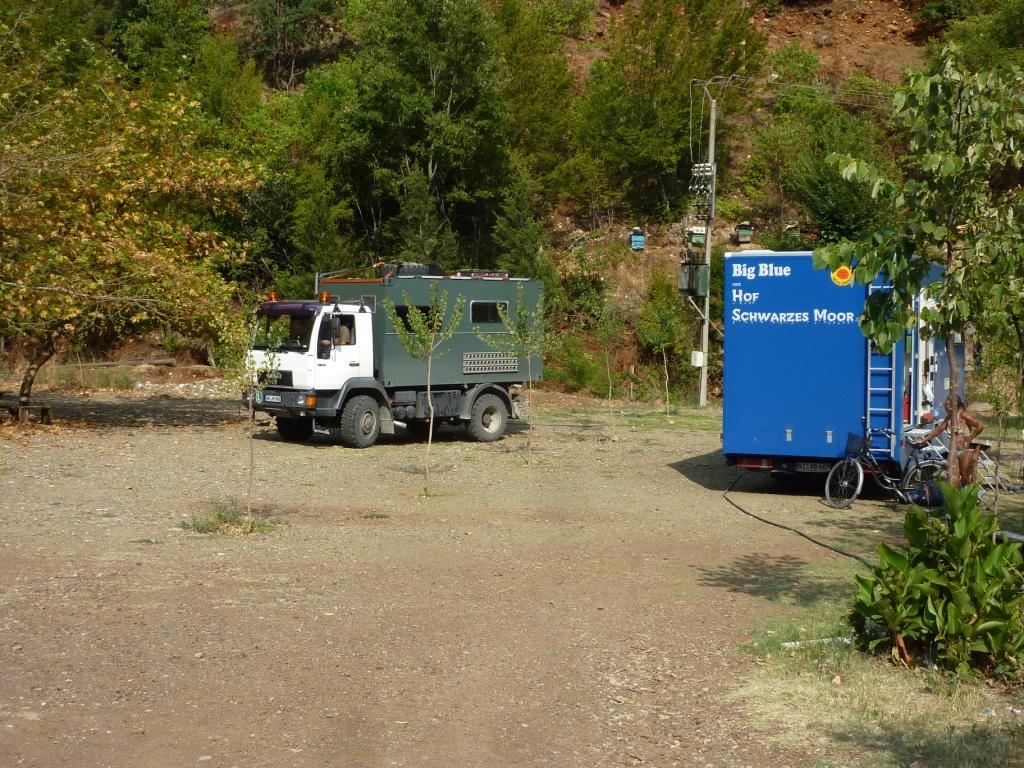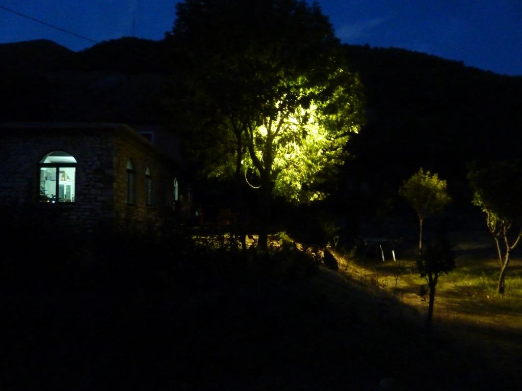 Der Betreiberin ist das alles sehr peinlich. Sollte es auch. Denn wir haben sicherlich viel Verständnis dafür, dass hier nicht alles perfekt ist. Das macht ja auch den Reiz Albaniens aus. Aber die Höhe seiner Einfahrt sollte man doch kennen. Vor allem, weil hier schon häufiger hohe (Allrad-) Fahrzeuge drin waren, die sicherlich auch so um die 3,60 Meter Höhe hatten. Also unser Tipp: Hier nur mit Karossen, die nicht länger als 8,00 Meter und nicht höher als 3,50 Meter sind. Dann steht man hier wirklich wunderschön zwischen Weinreben und einem Gemüsegarten. Die Familie gibt sich wahnsinnig viel Mühe, einem jeden Wunsch von den Augen abzulesen und für diese arme Region hat dieser Platz gute Sanitäranlagen. Es gibt Kinderbespaßungsinstallationen, überdachte Sitzgruppen und man kann den Grill benutzen. Und wir haben oben auf der Straße auch nicht schlecht geschlafen.