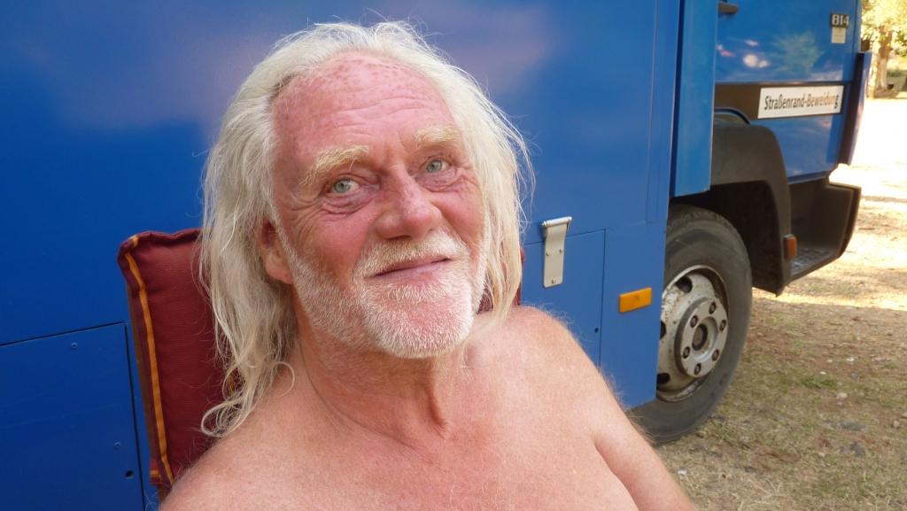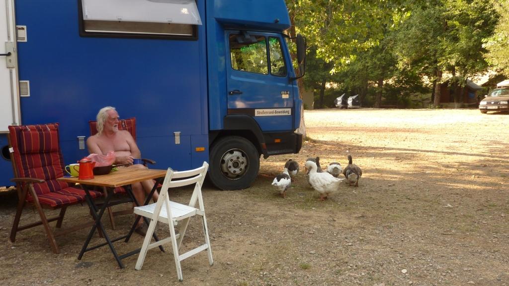Die Beiden haben im seit unserem letzten Treffen viel erlebt. Das kann man sich gar nicht alles merken. Aber die Beiden können wirklich schön erzählen. Auch Anita, wenn Rolf sie mal zu Wort kommen lässt. So teilen wir uns auf. Anita und Heidi gehen in den Schatten und Rolf und ich gesellen uns zu Clara und Thomas, zwei Österreichern, die mit ihrer Gitarre neben Big Blue ihren Platz gefunden haben. Ich muss bei Clara, wenn sie singt, an eine mit Dirndl bekleidete, vollbusige Sennerin denken. Diese Sprache, dieser Dialekt!