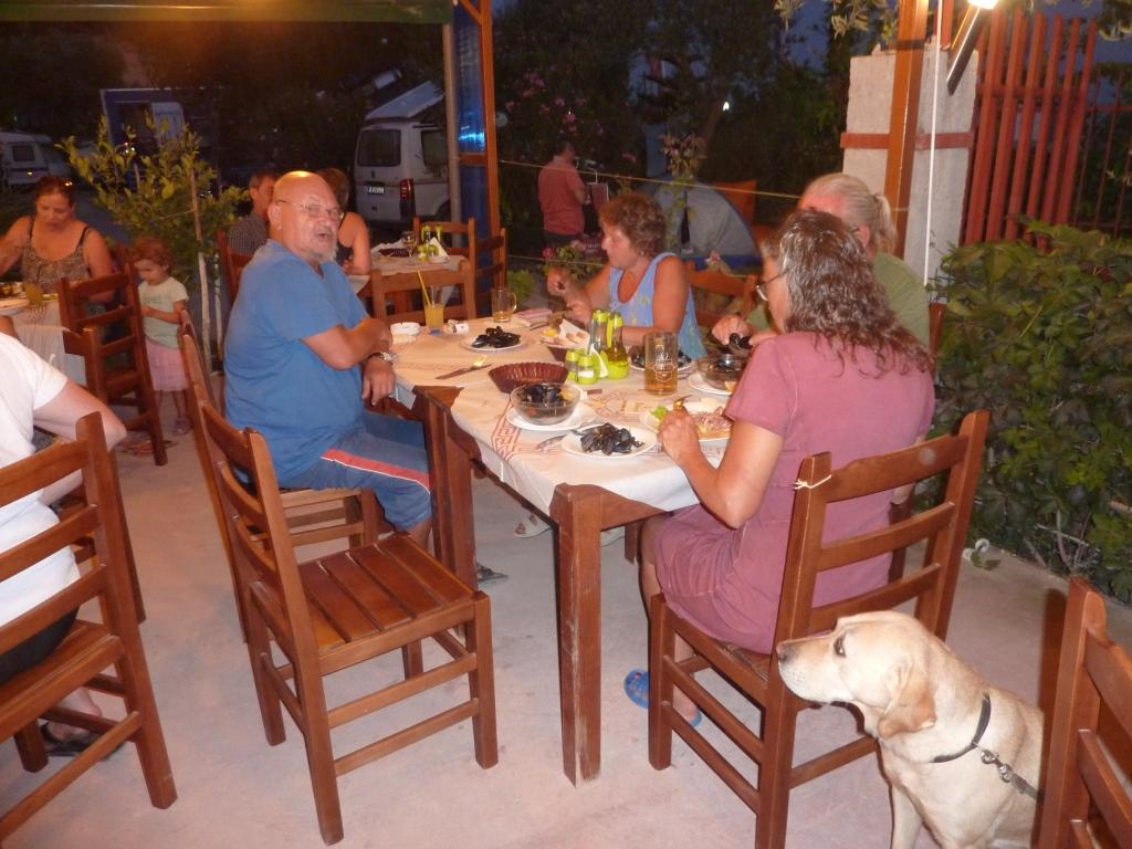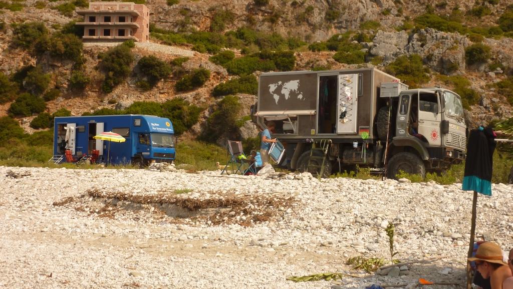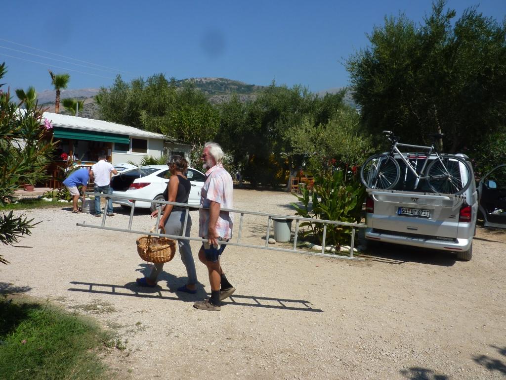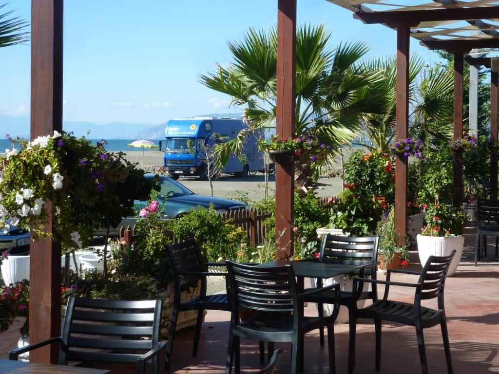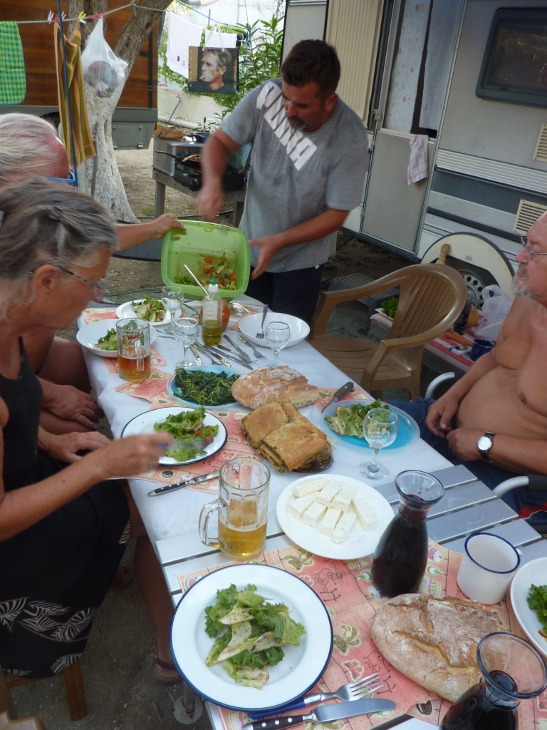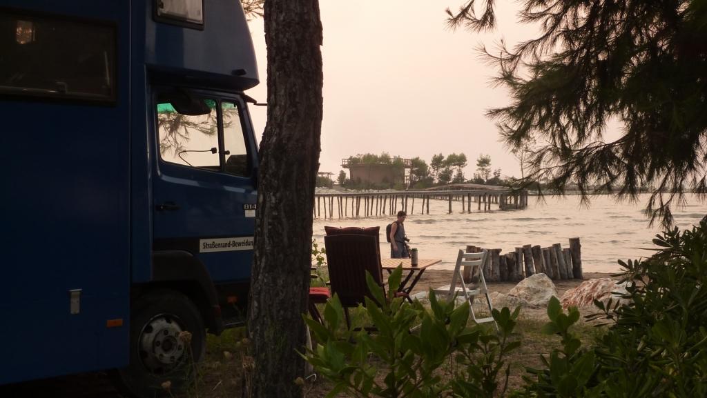 Marko ist heute nicht da. Wir werden später merken, er ist Einkaufen, was hier schon ein größerer Akt ist, da die Einkaufsmöglichkeiten doch recht weit weg sind. Alberto, sein Sohn sagt uns, dass er seine Familie besuchen fährt und wir daher einige Zeit dann hier alleine sein werden. Da haben wir nicht gegen, wenn nur das Bier, der Wein und Raki für uns erreichbar bleiben. Er hat sowieso nicht vor, das Restaurant abzuschließen. So ist alles in bester Ordnung. Bis Marco zurück kommt haben wir zwei Wohnmobile von der Straße gefischt und animiert hier auf die nächste Fähre – morgen früh – zu warten. Später kommt noch ein MB 208D dazu sowie ein Pärchen mit Mietwagen. Und ein französisches Paar per Motorrad. Der Platz wird voll. Man gut, das Marco eingekauft hat. So wird das Essen heute Abend wohl reichen.