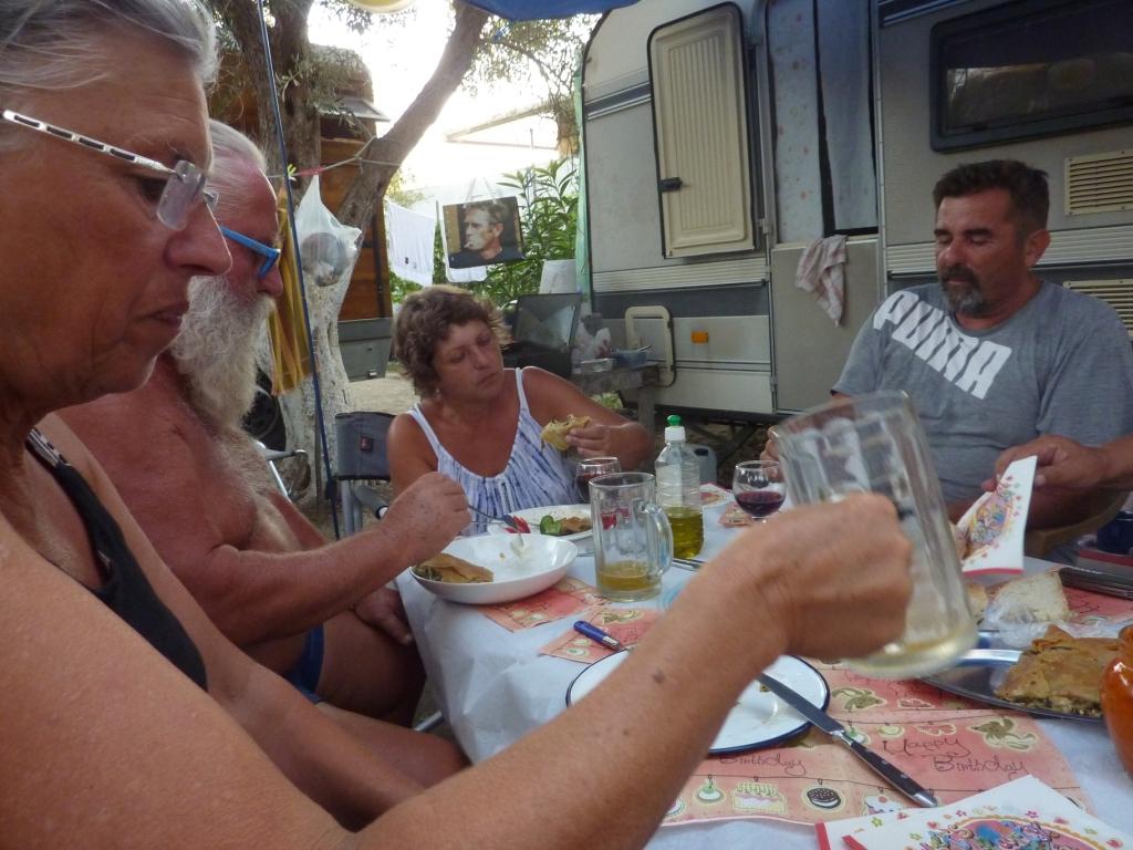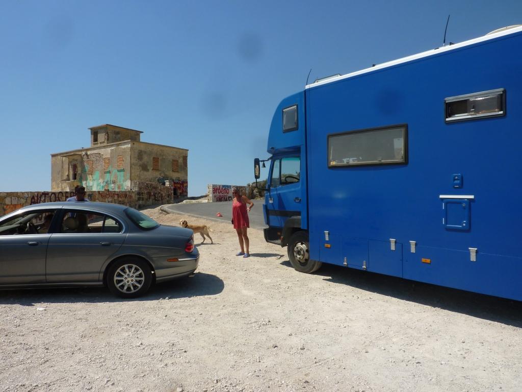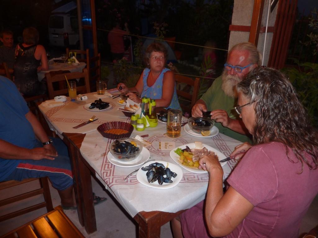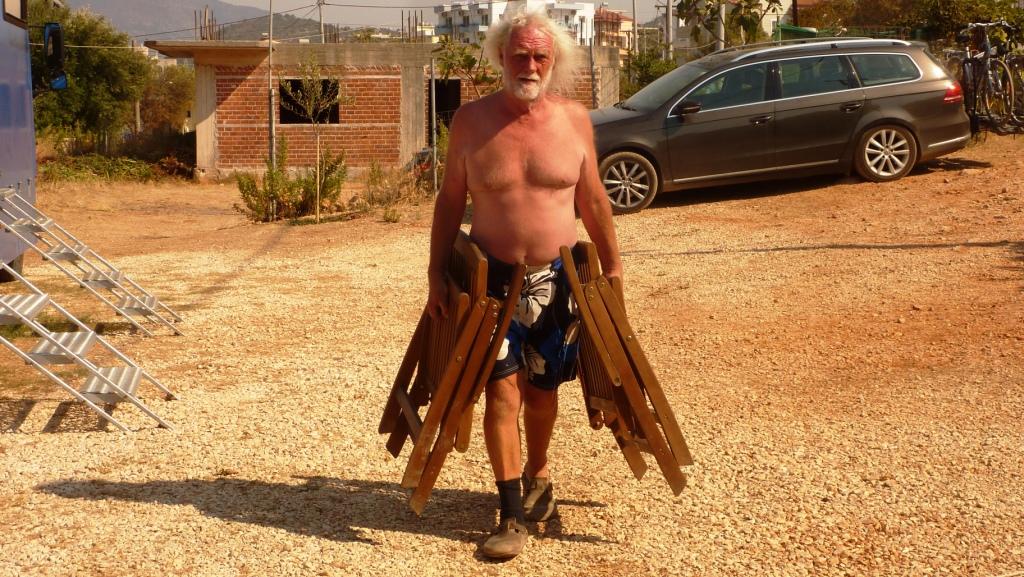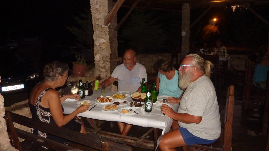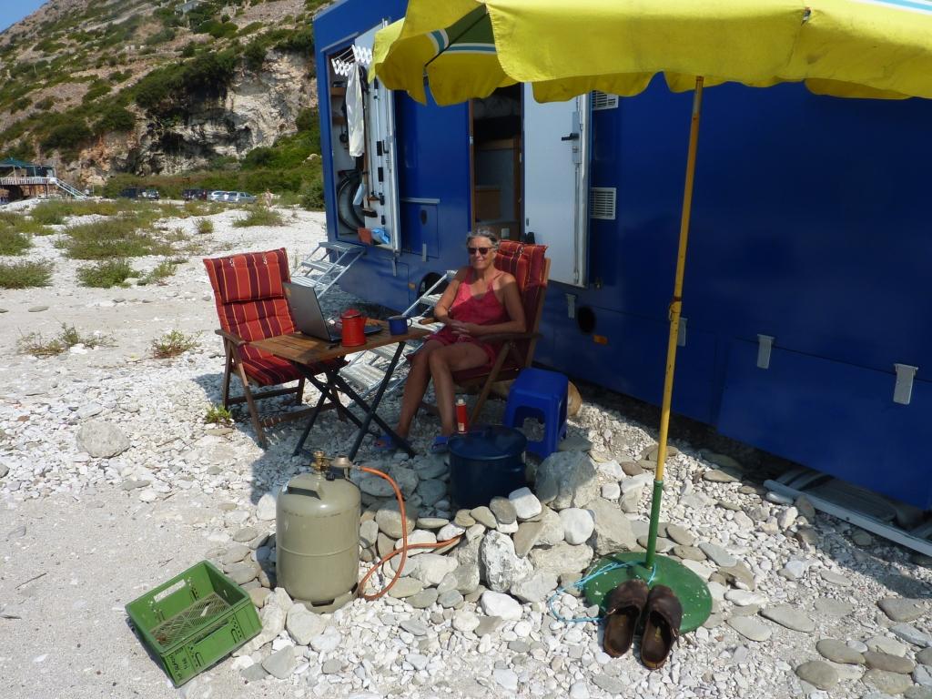 Marko ist heute nicht da. Wir werden später merken, er ist Einkaufen, was hier schon ein größerer Akt ist, da die Einkaufsmöglichkeiten doch recht weit weg sind. Alberto, sein Sohn sagt uns, dass er seine Familie besuchen fährt und wir daher einige Zeit dann hier alleine sein werden. Da haben wir nicht gegen, wenn nur das Bier, der Wein und Raki für uns erreichbar bleiben. Er hat sowieso nicht vor, das Restaurant abzuschließen. So ist alles in bester Ordnung. Bis Marco zurück kommt haben wir zwei Wohnmobile von der Straße gefischt und animiert hier auf die nächste Fähre – morgen früh – zu warten. Später kommt noch ein MB 208D dazu sowie ein Pärchen mit Mietwagen. Und ein französisches Paar per Motorrad. Der Platz wird voll. Man gut, das Marco eingekauft hat. So wird das Essen heute Abend wohl reichen.