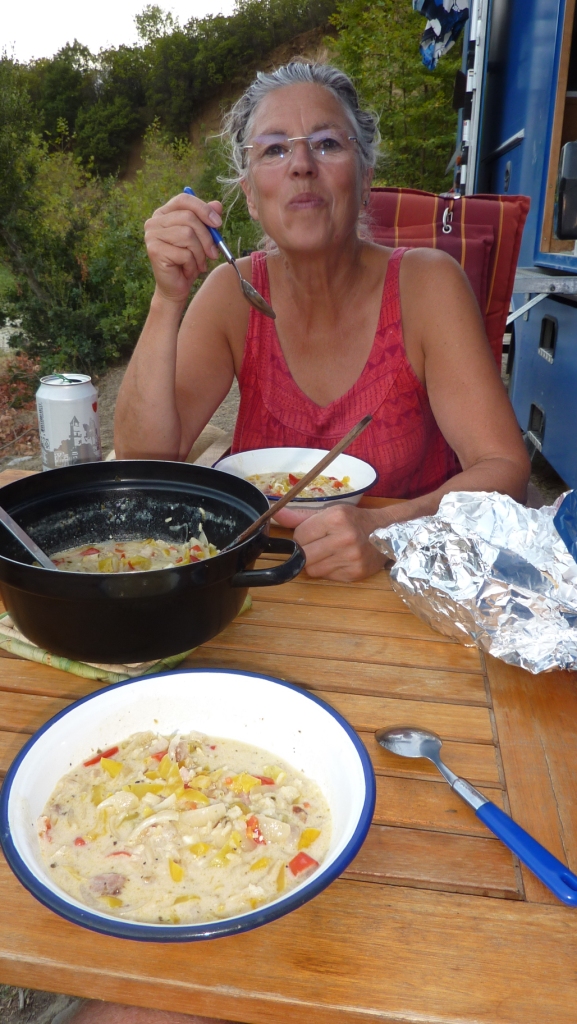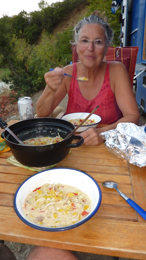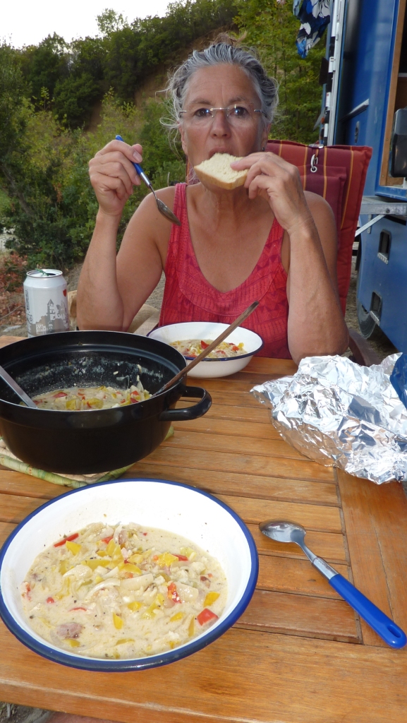 Dann gibt Heidi sich doch dem Verdacht hin, dass unser Gemüse nicht reicht, um heute Abend satt zu werden und gurkt noch einmal mit dem Fahrrad los. Und kommt nach zwei Stunden wieder. Jetzt haben wir genug für die nächsten Tage.