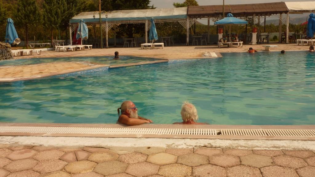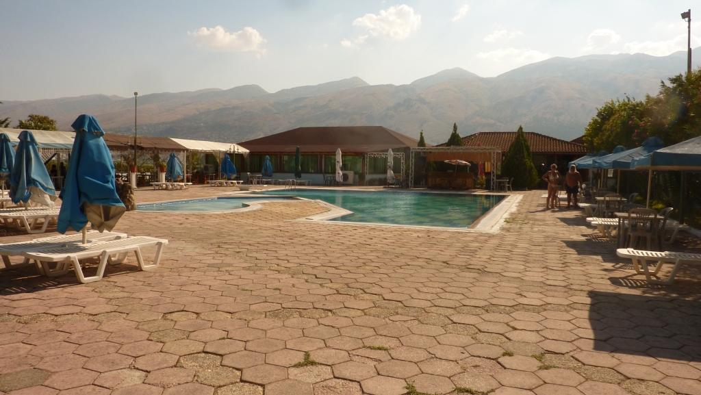 So kommen wir schon vor 13:00 Uhr wieder zurück auf den Platz und hüpfen erst einmal in den Pool. Heidi macht sich dann mit dem Hund auf den Weg, die Gegend zu erkunden. Und kommt ernüchtert zurück. Der Platz ist von Gewerbegebiet umgeben. Was in Albanien die Müllkippe gleich mit liefert. Der Fluss ist kaum zu erkennen zwischen dem Abfall. Und dem Hinweisschild „Zoo“ folgend, findet sie einen Bären und Affen, in verdreckten und viel zu kleinen Käfigen gehalten, vor. Den Standort des Bären werden wir der Organisation „Vier Pfoten“ melden damit diese eine Befreiung des Bären vorantreiben können. Bei den anderen Tieren sind uns die Hände gebunden.