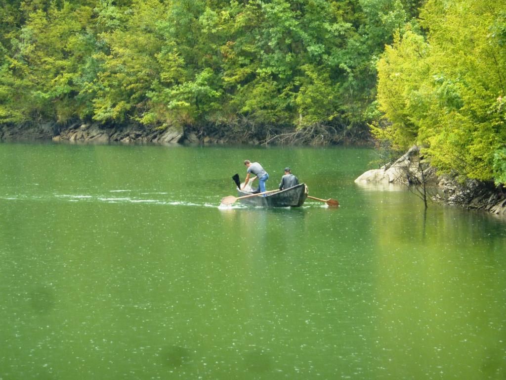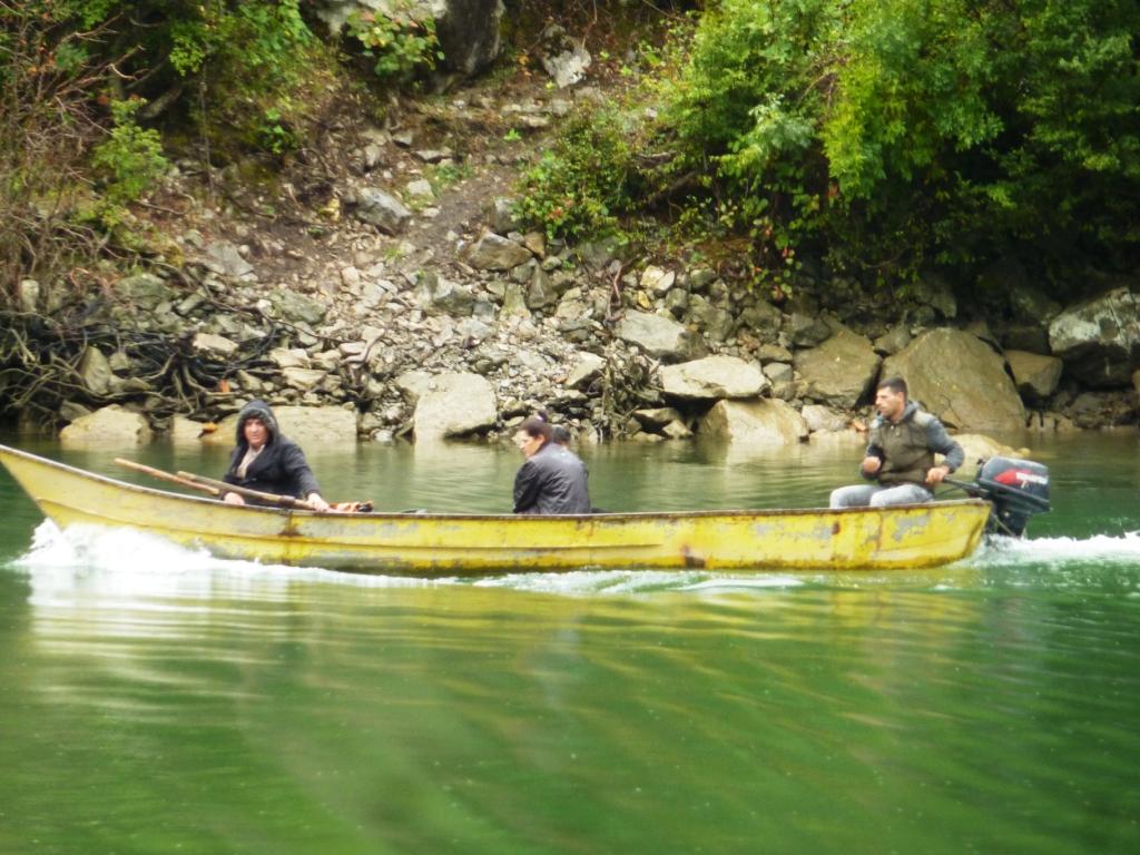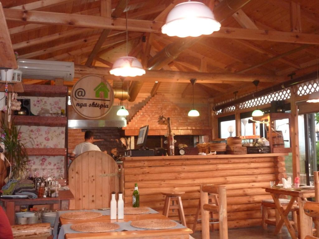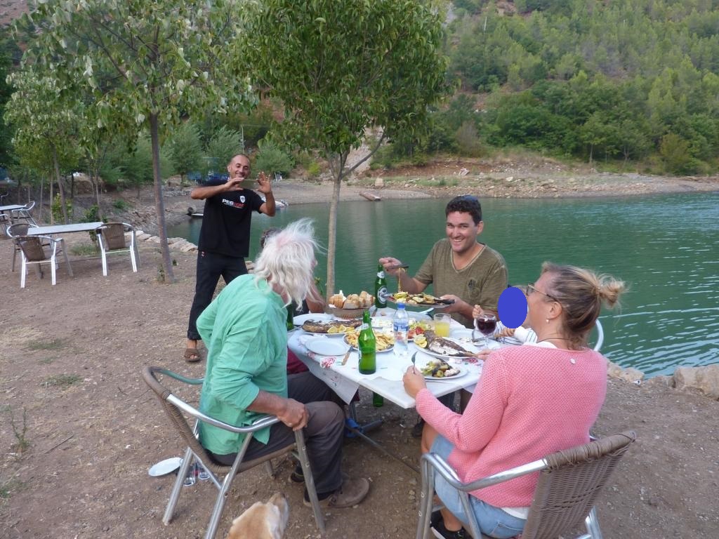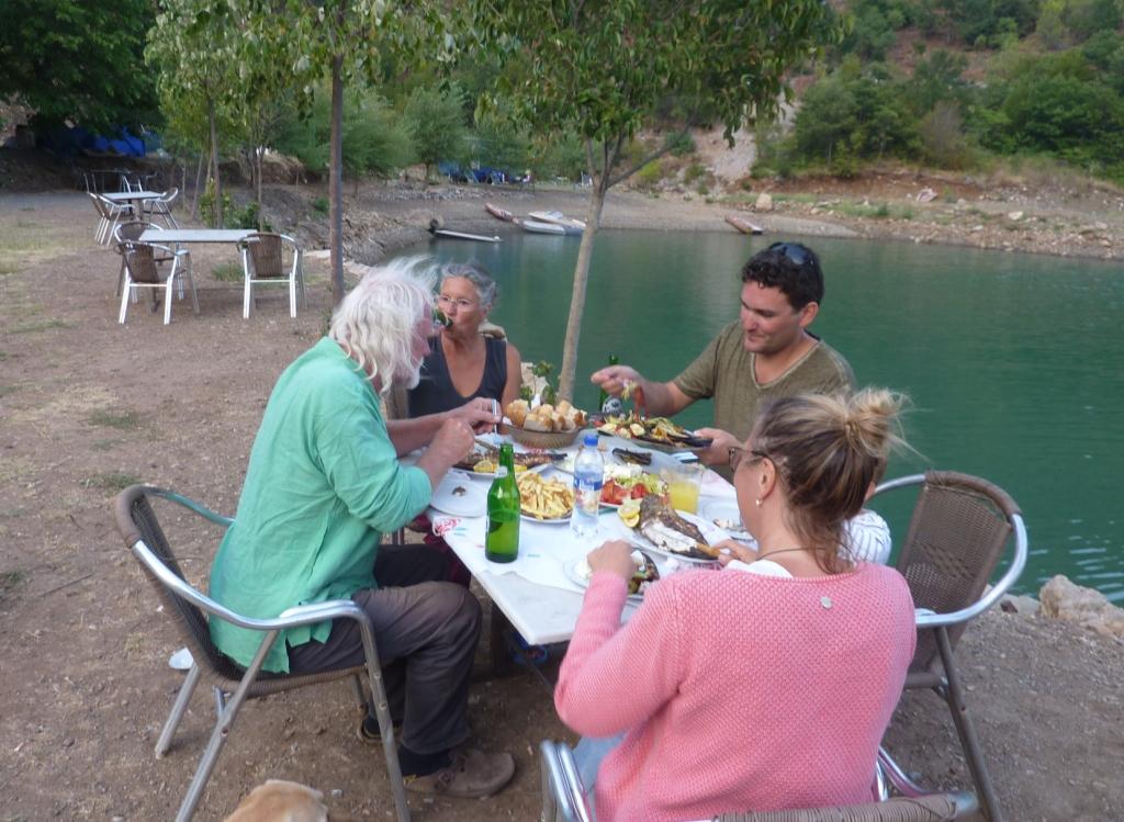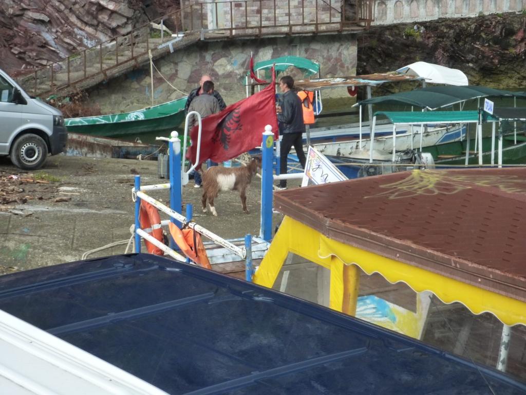 Zur Erläuterung: Dieses Restaurant wird von der Familie von Aleks, Gjioni und drei bis vier Männern ihrer Familie betrieben, der einiges von dem Land auf dieser und der anderen Seite des Sees gehören. Auf der anderen Seite haben sie im Berg eine Ziegenherde laufen und einen Stall in dem sie melken. Die Herde wird täglich von Zweien der Familie betreut. Fleisch und Milch wird hier selbst verarbeitet und im Restaurant und auf dem Markt als lebende Tiere, als Fleisch und Käse verkauft.