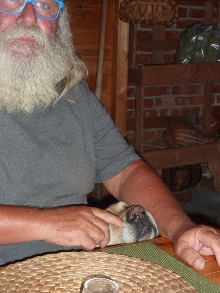 Vor dem weinbehangenen Tor der Campingplatzes fällt mir sofort auf, dass der Weinlaubengang, der letztes Jahr es unmöglich machte, auf die Terrassen direkt ans Wasser hinunter fahren zu können, weil zu niedrig, abgebaut ist. Für das optische Ambiente wirklich sehr schade. Aber so kommen wir dieses Mal auf die schöne Terrasse. Marko ist dieses Mal nicht so schnell wie 2016. Damals stand er sofort am Tor. Heute bemerkt er uns erst, als wir förmlich an seinem Tisch stehen, an dem er mit Freunden sitzt.