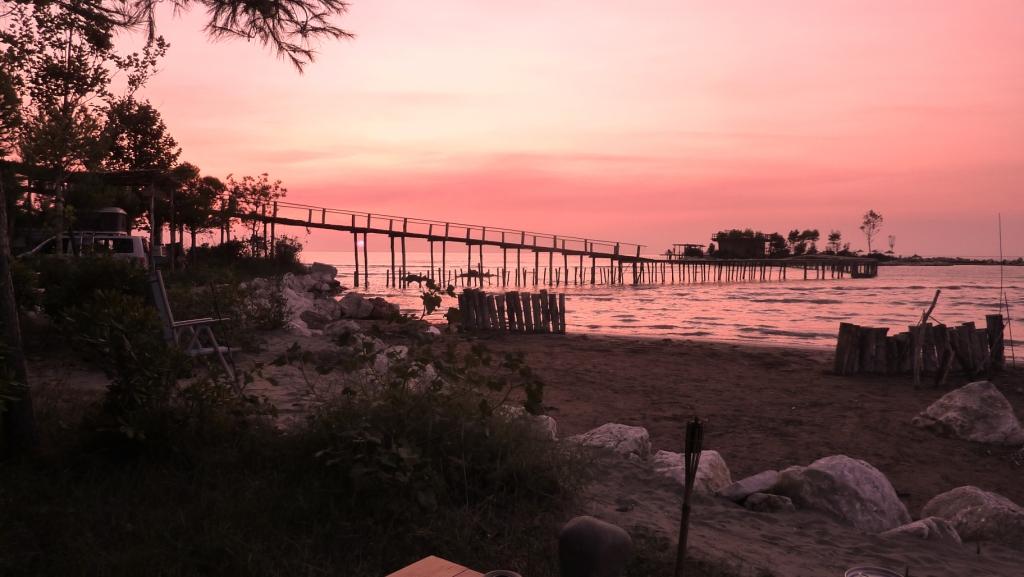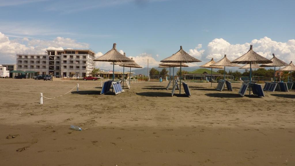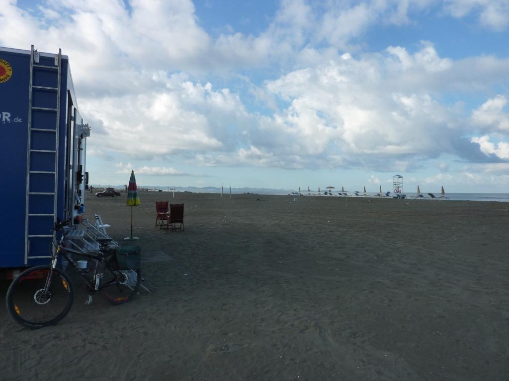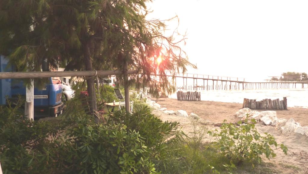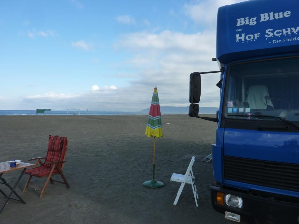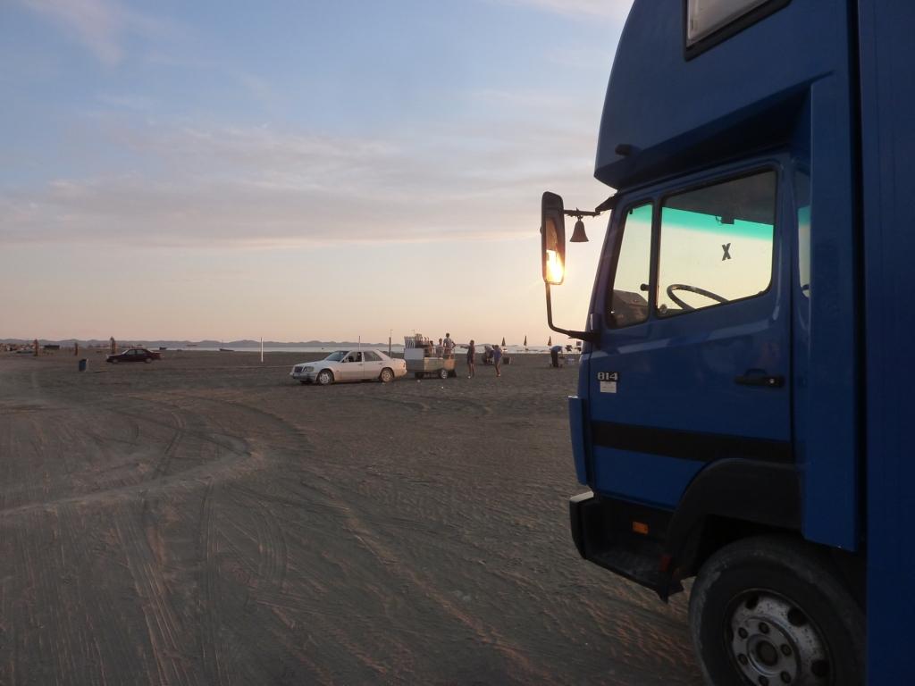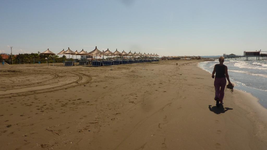 Am Strand angekommen, versuchen wir zuerst wieder die Stelle am Südende. Dort wo wir letztes Jahr standen. Das war jetzt aber nicht so prickelnd. Süßwasser im Rücken, Verdacht auf Mücken am Abend. So wandern wir den gesamten Strand Richtung Norden ab. Überall eifrige Männer beim Abbau der touristischen Infrastruktur: Sonnenschirme, Liegen, Autoscooter, kleine Strandbars und vieles mehr. Ist schon komisch. Hier erleben wir erstmalig, was Nachsaison hier bedeutet. Aber der Strand ist jetzt recht sauber und nur von wenigen Gästen besucht. Genau das was wir erwarten.