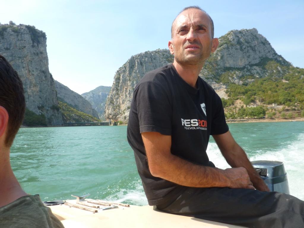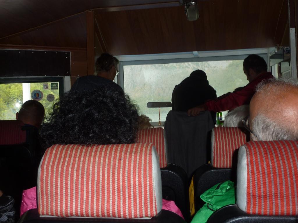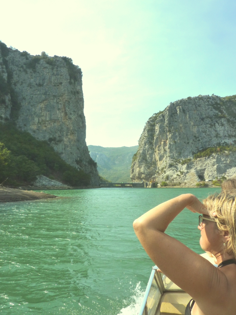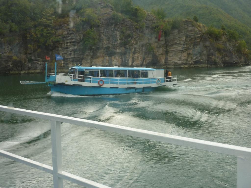 Das Wetter soll heute schlecht werden. Regen bis Gewitter und so. Hier auf dem Platz ist das Wetter noch gut. Aber Richtung Firze sieht das ganz anders aus. Die Bergspitzen in Wolken, teilweise bis in die Seitentäler des Stausees. Bei unserem Fußmarsch zum Fähranleger wird es uns noch richtig warm. Auf der Rozafafähre wird das gleich anders. Regen. Und jedesmal, wenn der Kapitän zwischen zwei Wasserstraßen entscheiden kann, fährt er immer in die, die vom Wetter her noch schlechter aussieht. Ich bereue es irgendwann, mir keine warme Jacke mitgenommen zu haben.