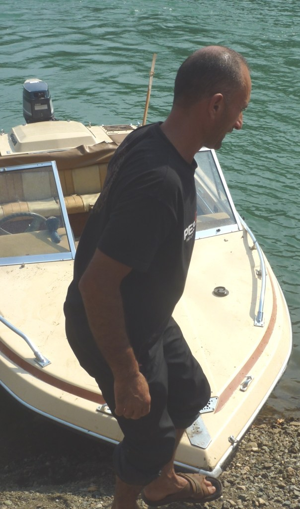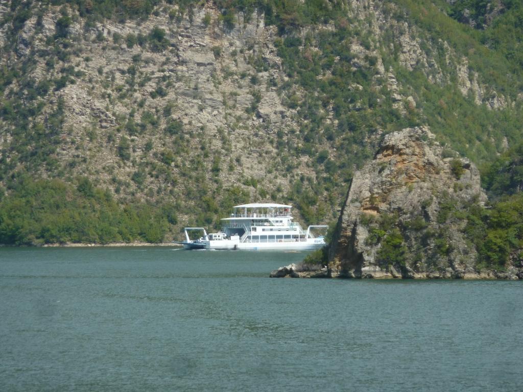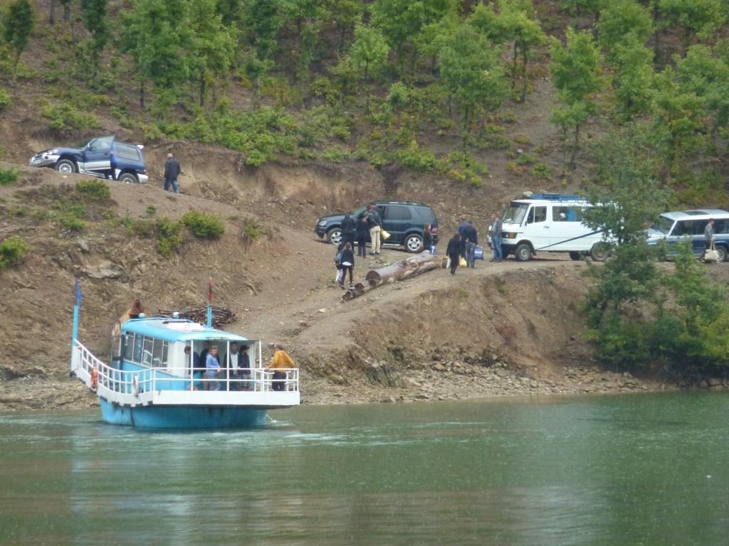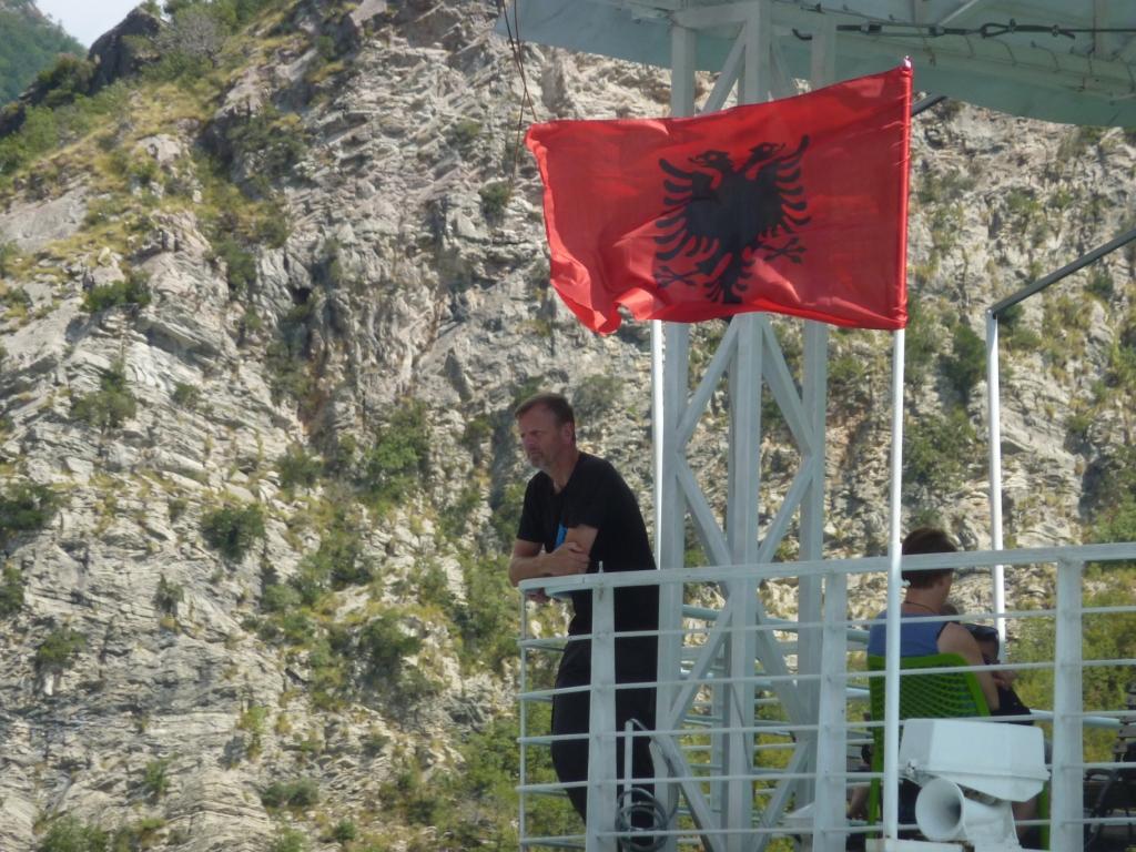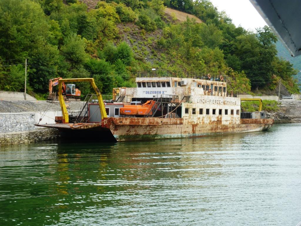 Nach circa drei Stunden kommen wir in Firze an. Hier hat sich viel verändert. Es ist ein neuer Anleger gebaut worden. Übrigens nachdem man den alten durch den asphaltieren Anschluss an die Straße aufgewertet hat. Auch hier am neuen Anleger sind wieder verschieden hohe Rampen betoniert worden. Der Albaner liebt Beton. Aber alle drei Rampen sind heute von der Fähre nicht nutzbar. Wegen des aktuellen Wasserstandes. Ungefähr einen Meter unter Normal. So muss auch dieses Mal an der Stelle angelegt werden, wo mit der Rampe der Fähre und der Schaufel des Rampenmeisters erst eine Anlegestelle präpariert werden muss.