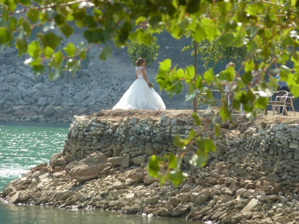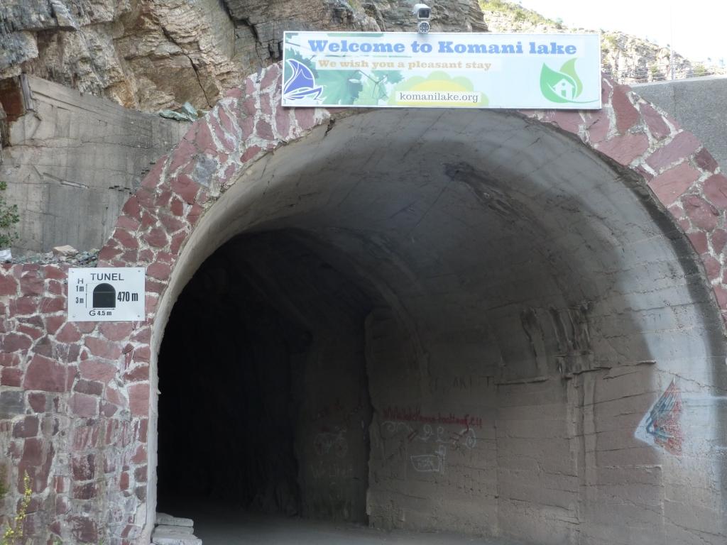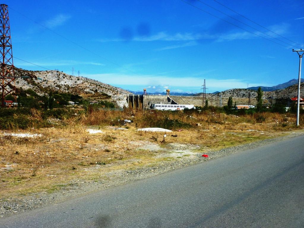 So nutzen wir die Zeit mal durch den Tunnel stromab zu gehen. Leider ist der Weg über die alte Straße um die Felsspitze versperrt. Sicherheits- und Sperrgebiet wie viele Staudämme in diesen ehemaligen sozialistischen Staaten. Durch den Tunnel ist nicht so prickelnd, da wir nie wissen, ob die Wochenendtrunkenen Albaner und – trotz Taschenlampe – überhaupt sehen. Unterhalb des Tunnel ist der Blick frei auf das Kraftwerk, und viel spannender, auf eine Ansammlung von Häusern (wohl die Wohnungen der KarftwerksarbeiterInnen) mit Nutzgärten bis hin zum Weinanbau sowie einer Autowaschbude, eine Bar und Restaurant, Toiletten für die Furgon Fahrgäste und Wasserzapfstelle. Heute laufen die Gäste von Bar und Restaurant im Anzug rum. Es ist Sonntag! Die Furgons fahren trotzdem. Fast im Viertelstundentakt. Und die LKW auch!
