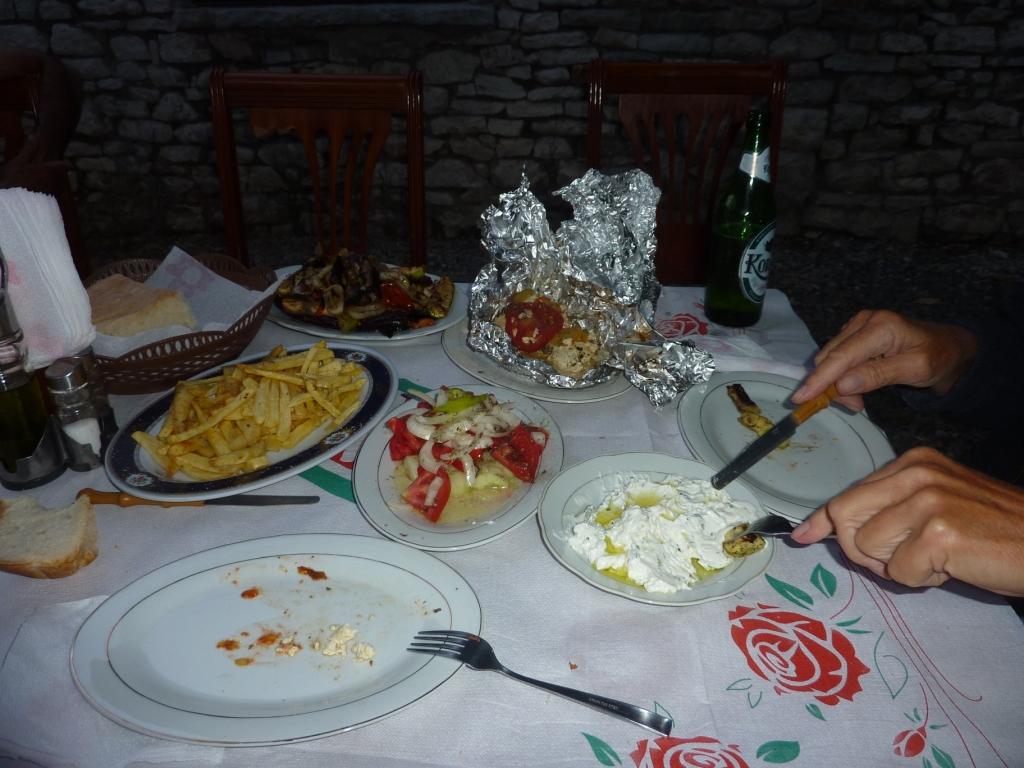 Aus unserer Bestellung: Gegrilltes Gemüse, Tsatsiki, frittierte Kartoffeln und Brot wird das Genannte plus (!) Salat und ein riesiger Teller mit gebackenem Käse und Gemüse. Wir sitzen lange zusammen. Die Drei erzählen von ihrem Leben vor allem als Schäfer hier in den Bergen. Das Leben hier ist hart, aber die Drei lieben es offensichtlich. Wir zeigen ihnen dann mal, wie wir das mit der Schäferei bei uns machen. Den Trailer, den Barbara mal bei uns gedreht für den NDR gedreht hat und den Film „Der Bioschäfer“ aus der Serie NDR typisch. Am meisten beeindruckte sie unser altes Haus und unsere Arbeit im Schnee. Nach einigen Rakis geht es dann für unsere Verhältnisse spät ins Bett.