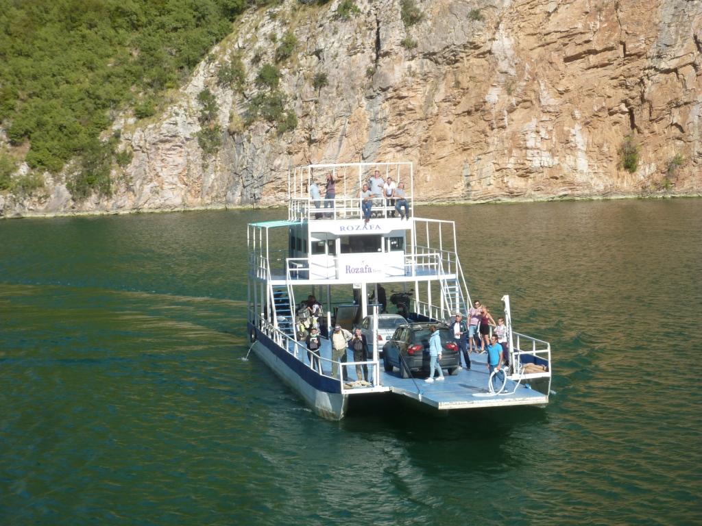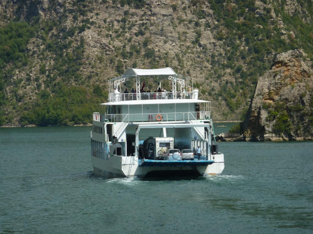 Einen Happen essen und dann gehen wir hoch zu Fährhafen. Da hat sich nicht viel geändert. Es ist nur weniger los. Es ist halt Nachsaison. Dann kommen gegen 16:00 Uhr die beiden Fähren um die Ecke. Es hat sich doch einiges verändert. Die Fähren sind überholt worden. Zumindest neu gestrichen. Es sind andere Besatzungen an Bord, als die, mit denen wir uns 2016 angefreundet haben. Vor allem Lara. Die Rozafafähre hat jetzt einen Stahlboden und nicht mehr Holzbretter, durch die man auf das Wasser durchschauen konnte. Trotzdem werden wir morgen mit dieser wieder unsere Tour über den See machen. Wieder hin und zurück, ohne Big Blue. Denn trotz eines neuen Schildes am Tunnel, der die Höhen dieses neu definiert und den Erfahrungen eines Facebook Bekannten, der vor kurzem mit einem 3,90 Meter hohen LKW hier durchgefahren ist, werden wir dieses Wagnis nicht eingehen.