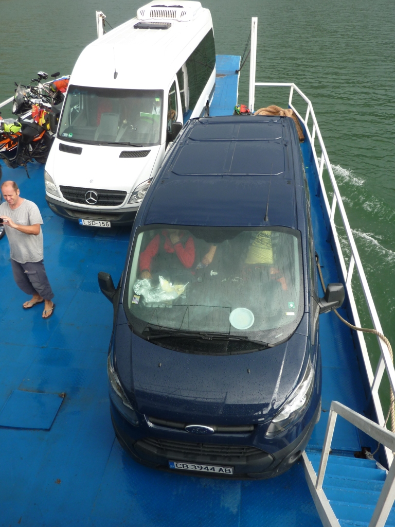 Und die Fähre, die LKW in die Nebentäler bringt für den Kiesabbau lebt auch noch. Unvorstellbar. Uns fallen die mit Ziergittern zugeschweißten Kabinenfenster auf. Sollen die den Einbruch oder das aus Angst vor dem Sinken Flüchten der Mitarbeiter verhindern?