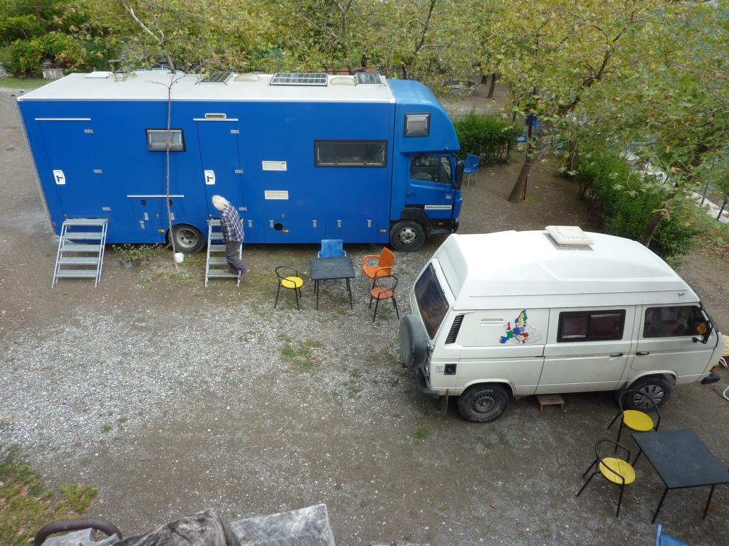 Auf dem Rückweg treffen wir doch tatsächlich Erika und Michael (die Beiden mit dem T3 in Koman) auf dem Rückweg aus dem Valbonëtal. Dort stehen jetzt auch schon die Reisebusse Schlange. Und geregnet hat es auch heftig und andauernd. Jetzt wollen sie noch kurz in Shkodra schlendern gehen und dann ab nach Montenegro. Gute Reise euch Beiden!