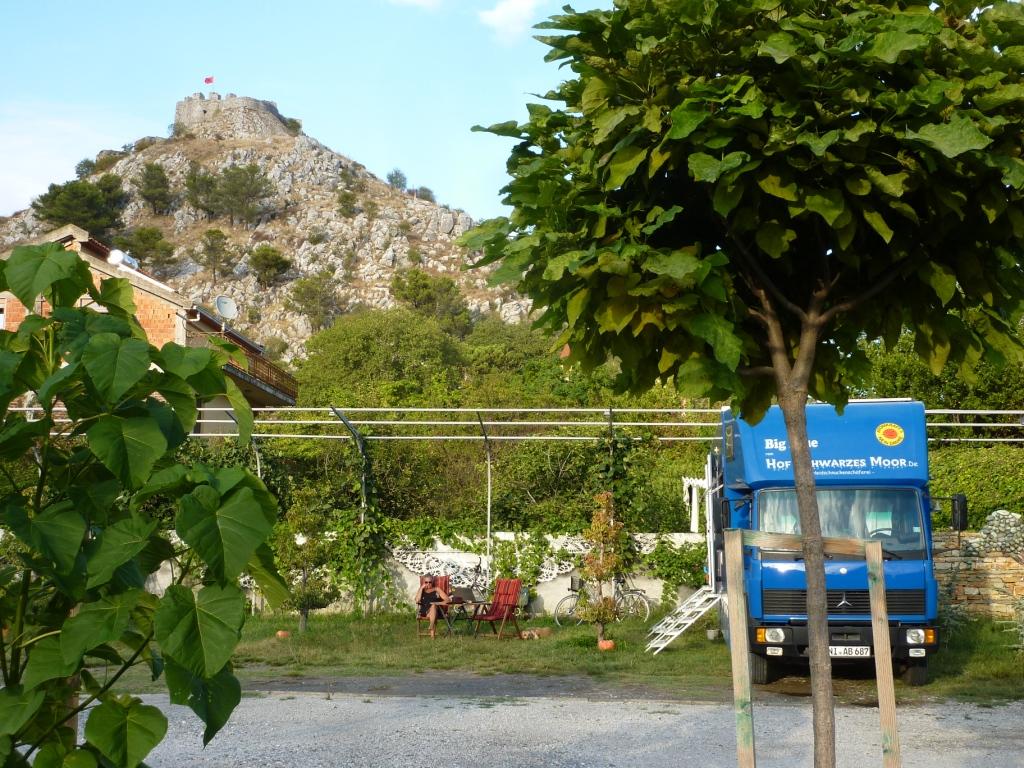 Wir entscheiden uns deshalb dieses Jahr für den Campingplatz Lejienda an der Südeinfahrt von Shkodra. Ein mit viel Liebe und künstlerischem Aufwand am Fuß der Rozafaburg betriebener Platz. Die Zuwegung und auch die Nachbarschaft muss man unter „albanisch im nicht positiven Sinn“ verbuchen. Leider. Dafür haben die hier einen exzellenten Pool, vielfältigste Einrichtungen für Alle und ein herausragendes Restaurant.