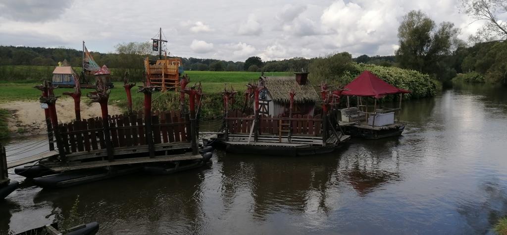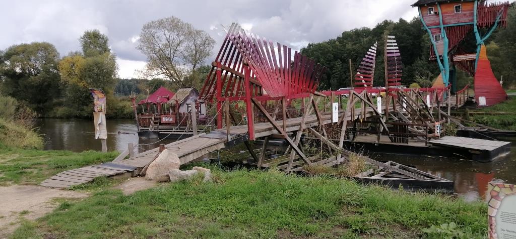 So mache ich mich dann auf den Weg zur Kulturinsel Einsiedel, circa 20 Kilometer nördlich von Görlitz an der Neiße. Wenn ich mich richtig erinnere, hat ein Freund vor circa 14 Jahren uns von diesem Ort erzählt. Damals haben dort engagierte Menschen in den Bäumen an der Neiße die ersten Baumhotels (in der Ex-DDR) geschaffen. Und vor wenigen Tagen hat auch Sven mir diesen Ort empfohlen. Ebenso bei der Abreise vom Kühlhaus Weinhübel hat mir der Mensch an der Rezeption diesen Ort empfohlen als einen Platz, an dem man sich mehrere Tage aufhalten kann, wenn man sich auf ihn einlässt.