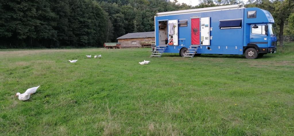 Big Blue wird die ganze Zeit von Flugenten umlagert. Gegen 17:00 Uhr kommen dann die Ziegen zum Melken rein. Das ist mal wieder was für mich. Die Stunde unterhalte ich mich mit den beiden recht ausführlich über ihren Betrieb. Und was sie hier wie herstellen und vermarkten. Es ist überall das gleiche: Wenn man so wunderschön abseits von Lärm und Krach lebt, ist es nicht ein Selbstläufer, seine Waren an die KundInnen bringen zu können. Die Familie hier fährt mit ihrem Verkaufswagen die Märkte der Umgebung ab und haben sich über die Jahre eine verlässliche Stammkundschaft aufgebaut. Das ist auch nicht selbstverständlich, vor allem aber nicht einfach.