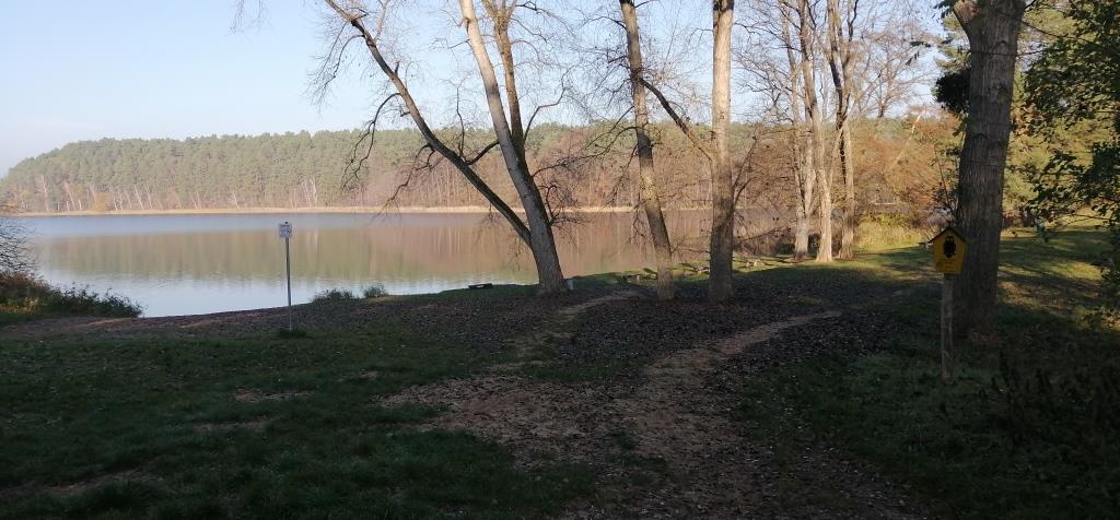 Gegen 6:00 Uhr beginnt auf dem Parkplatz das Dating Karussell. Aber alles läuft wie auch schon gestern in Ruhe und Besinnlichkeit ab. Kein Grund sich zu ängstigen oder aufzuregen (wie ein Kommentator auf p4n). Nach dem Frühstück drehe ich noch einmal eine Runde um den See und versuche mal den Wölbäcker zu finden. Der ist hier überall ausgeschildert auf Wegweisern der „Zeitspuren“. Irgendwie bin ich aber zu dumm, diese Spur zu finden. Dafür stoße ich auf einen Mountainbike Parcours.