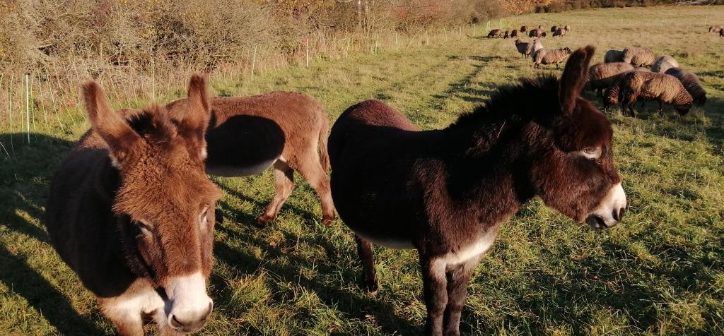 Diese halten im Haupterwerb die Schafsrasse „Rauhwolliges Pommersches Landschaf“. Nebenbei laufen auf den Weiden, an deren Rand ich zum Stehen komme, auch Ziegen und Esel herum. Ich tippe mal, die Ziegen, weil die das fressen, was die Schafe nicht mögen. Und die Esel als Schutz vor Wölfen.