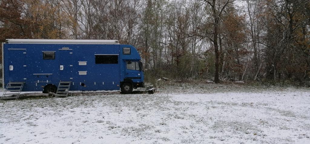 Wie schon gestern Abend angedeutet: Ich wache auf und draußen ist die Landschaft nicht mehr in den vielfältigen Herbstfarben am Leuchten. Nein, heute Morgen ist es weiß draußen, und das nicht zu knapp. Und es schneit. Und das recht stark! Zur Erinnerung: Ankunft/Weiterreise